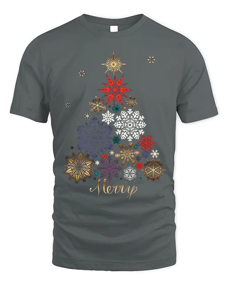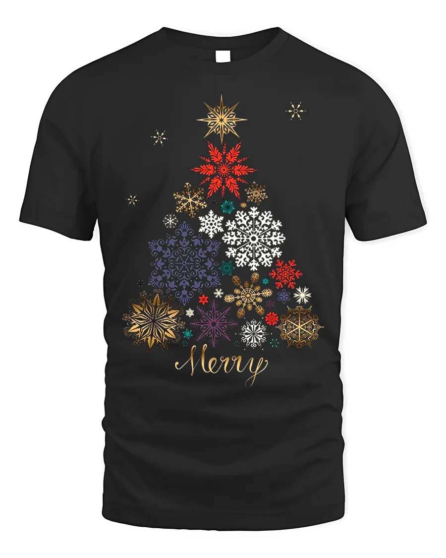 Bring a touch of elegance and festive sparkle to your wardrobe with our Elegant Snowflake Christmas Tree Stars Graphic T-Shirt. This stunning design features a beautifully arranged Christmas tree made from colorful snowflakes and golden stars, capturing the magic of the season with a modern, stylish twist. Perfect for those who love a classy yet cheerful holiday look.
