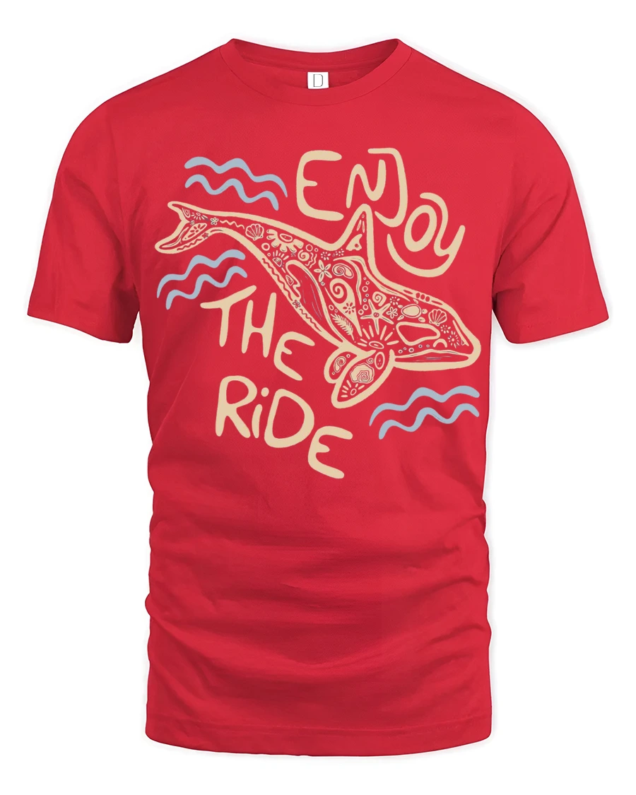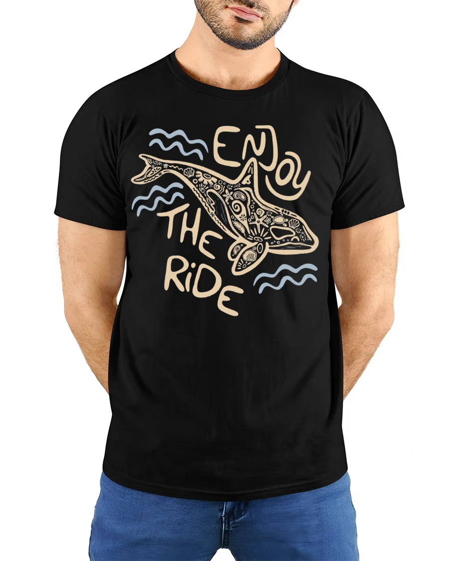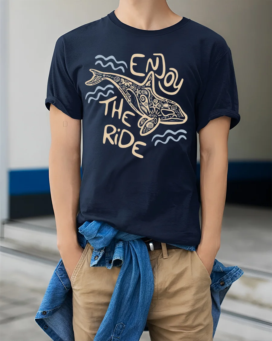 This tshirt offers a comfortable feel ideal for casual outfits, beach trips, travel adventures, or relaxed everyday wear. The enjoy the ride message symbolizes mindfulness and appreciation for life experiences, while the dolphin illustration adds natural charm and creative personality. Its versatile aesthetic pairs easily with modern casual fashion, helping create a confident and expressive appearance.