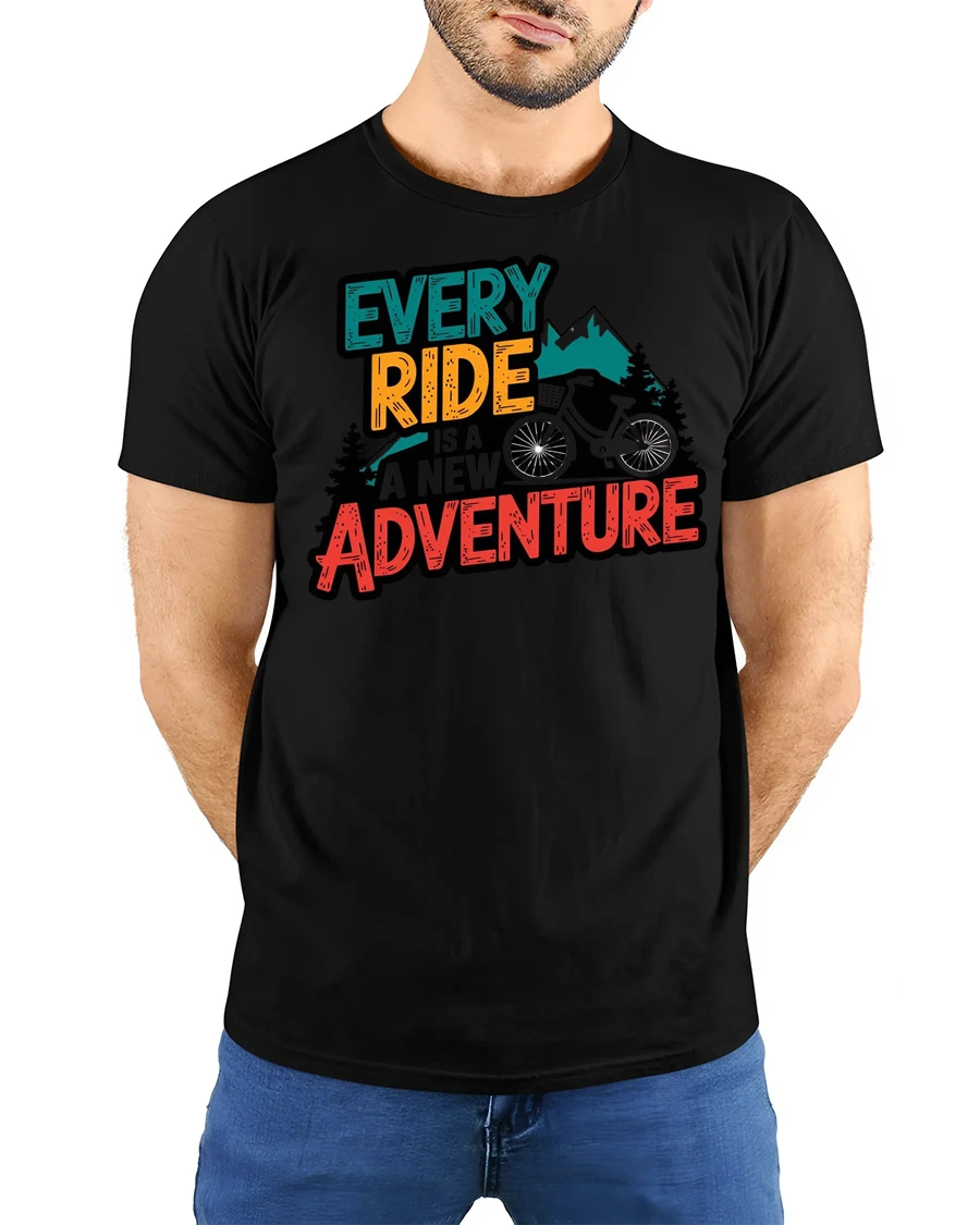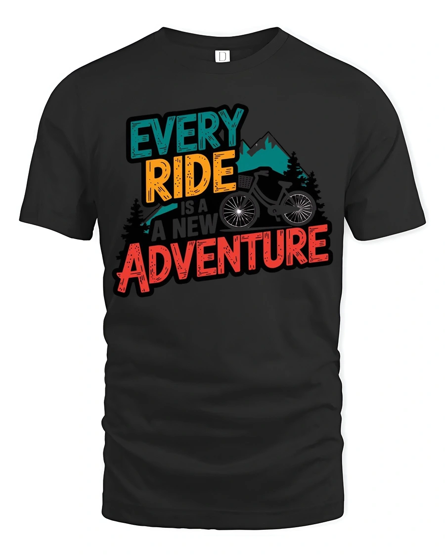 Every Ride Is A New Adventure Cycling Mountain Graphic Tee Tshirt - black t-shirt on white background