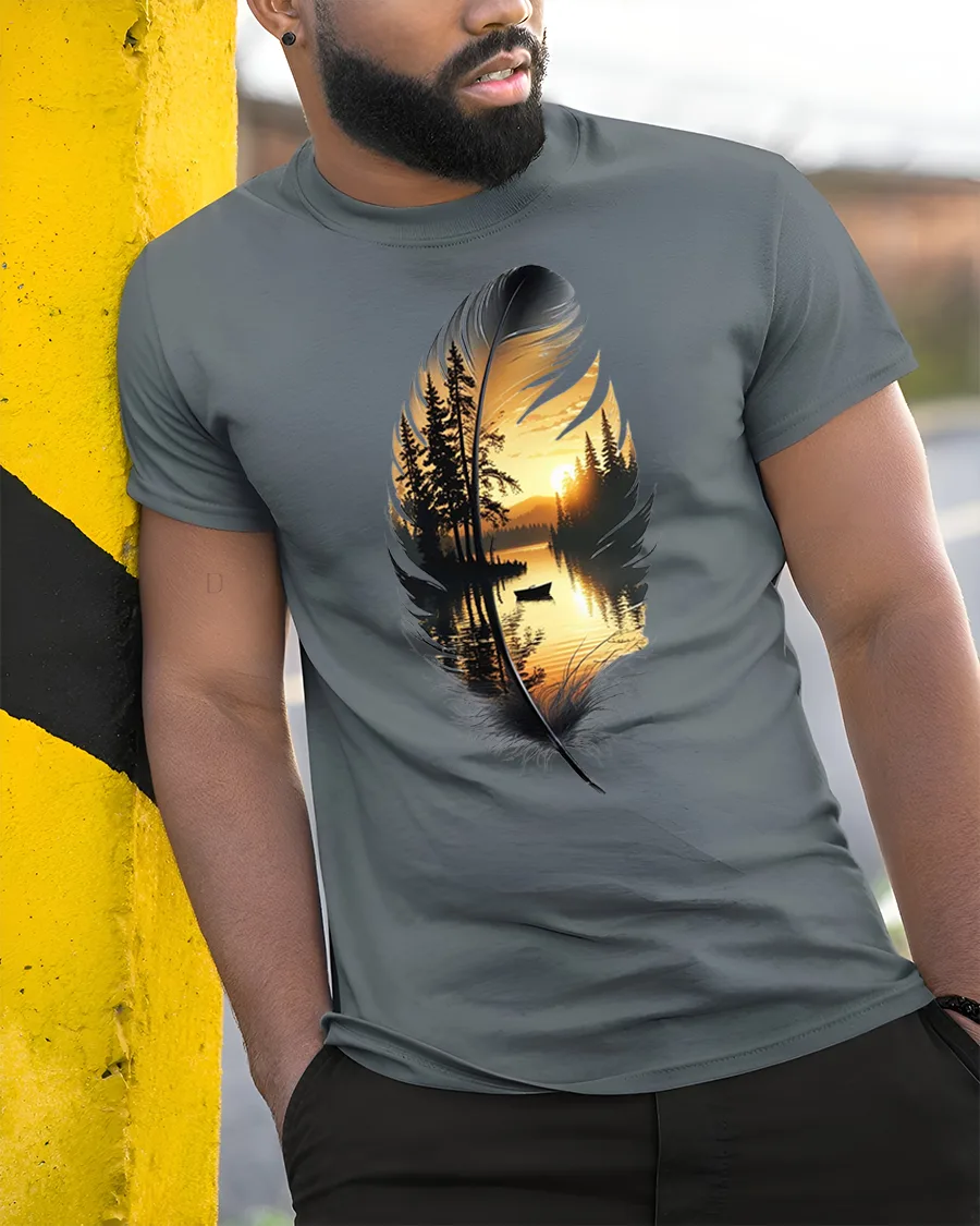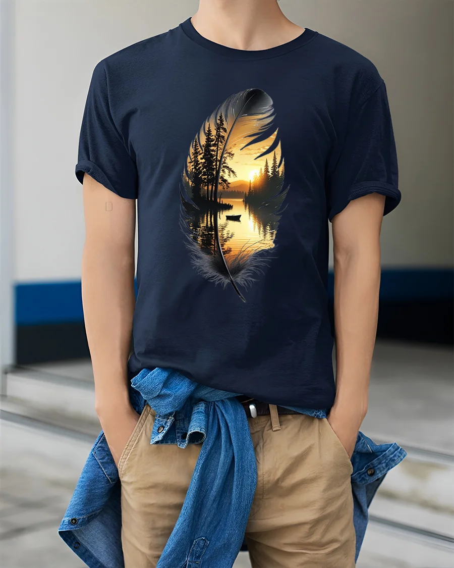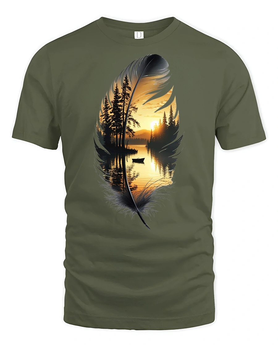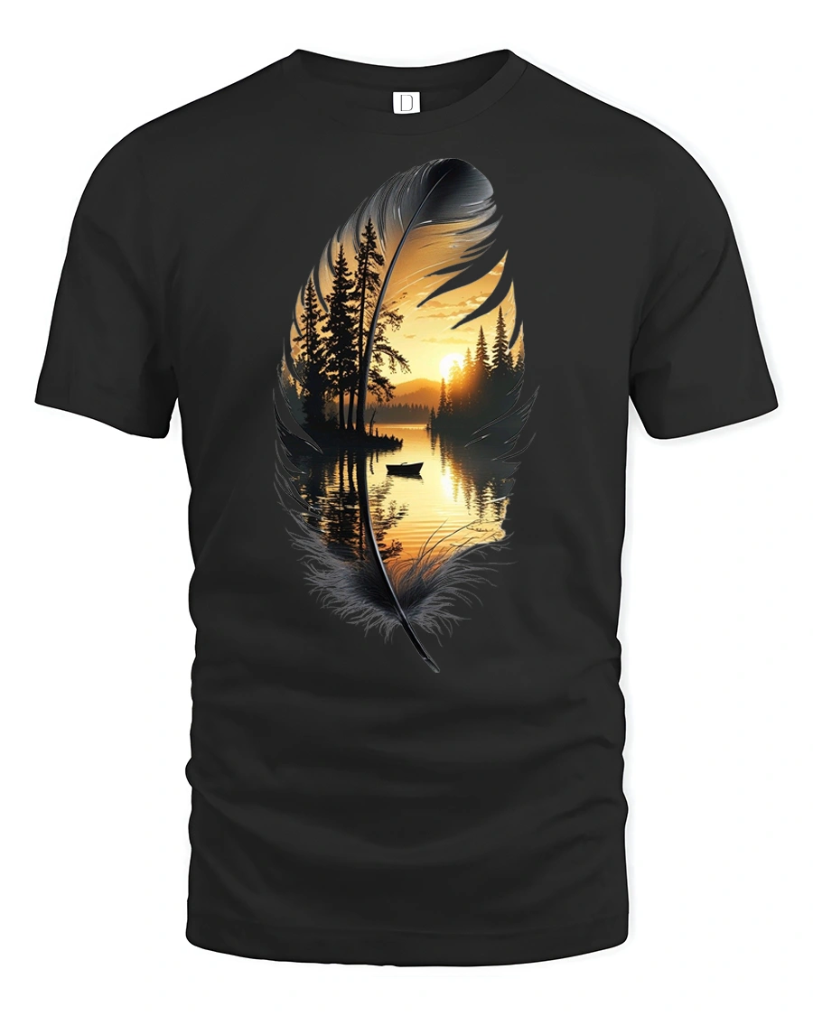 With its elegant feather shaped artwork and tranquil sunset scenery, this shirt delivers a timeless nature inspired design filled with peaceful wilderness charm and artistic style.