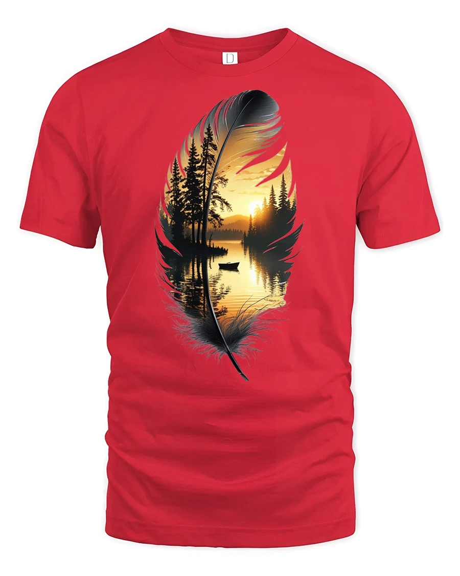 This feather lake sunset nature landscape artistic graphic t shirt features a stunning nature inspired illustration shaped within a graceful feather silhouette.