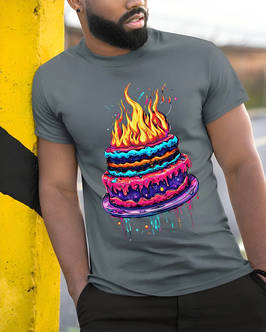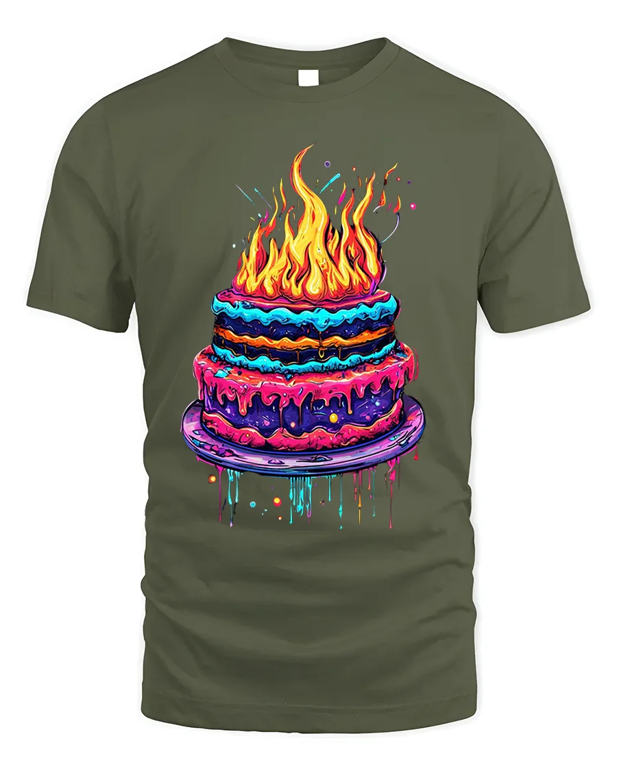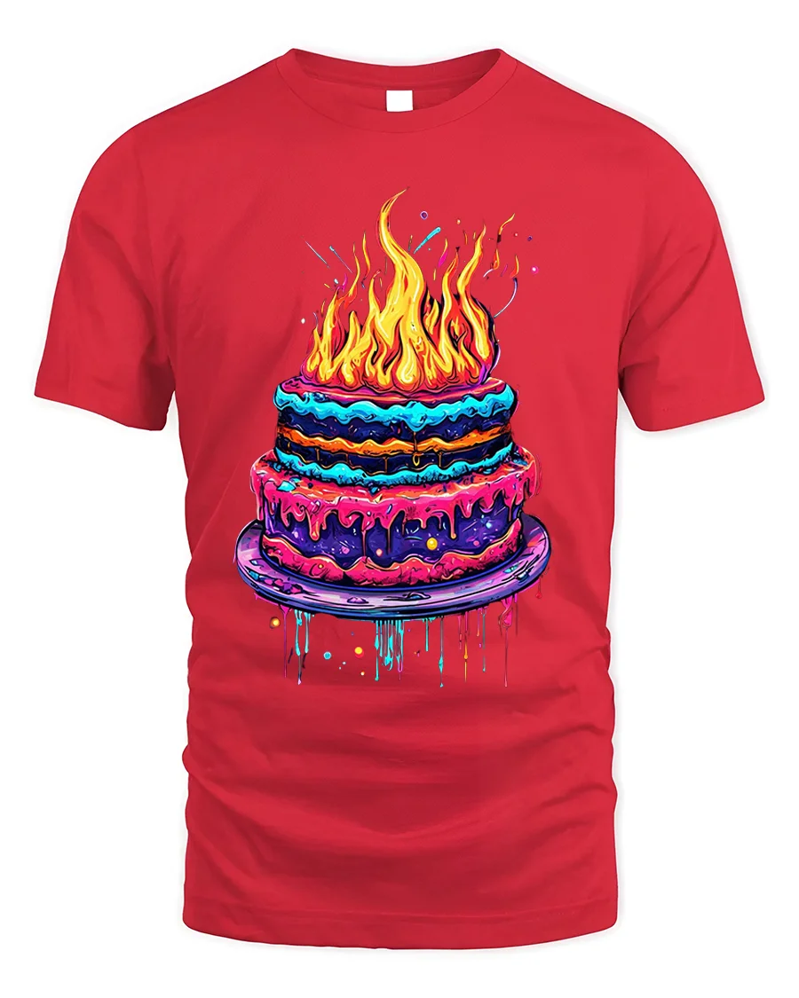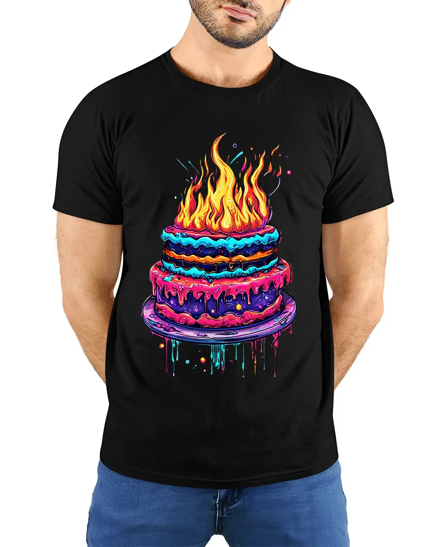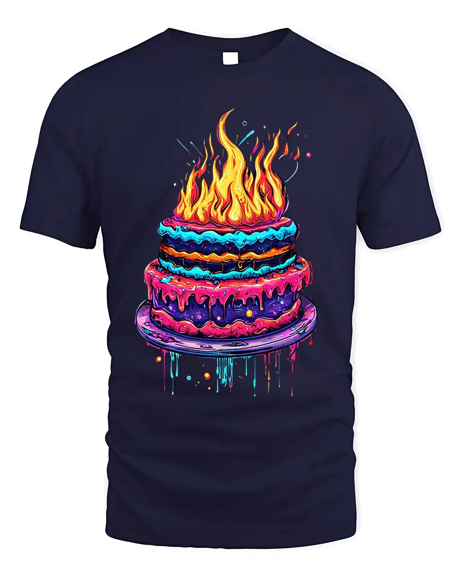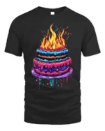 The Flaming Birthday Cake Neon Art Graphic T-Shirt brings bold celebration energy and artistic flair to your wardrobe. Crafted from premium cotton blend fabric, this tee combines comfort and creativity with a vibrant neon design that features a flaming, multicolor birthday cake dripping with color and personality. The dynamic mix of fire and sweetness creates an eye-catching contrast that’s impossible to ignore.