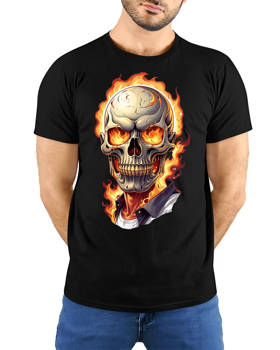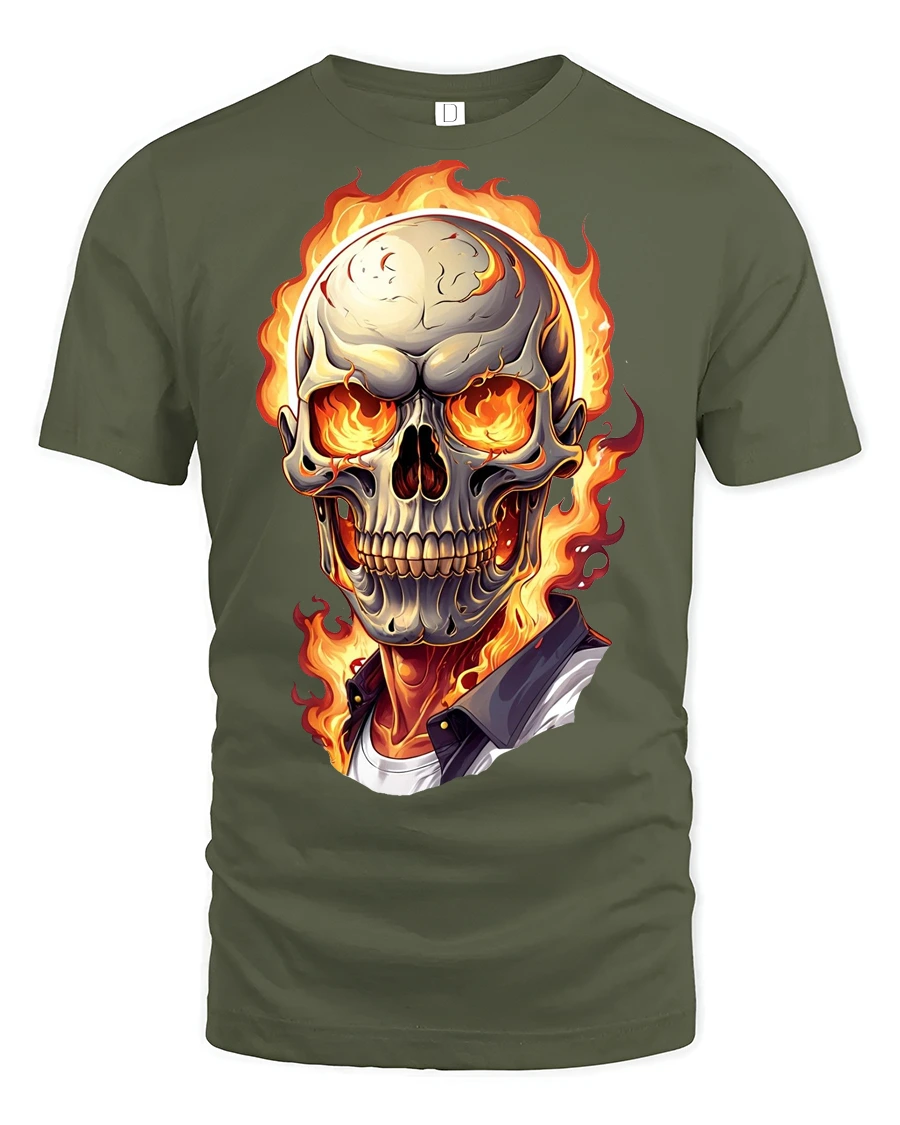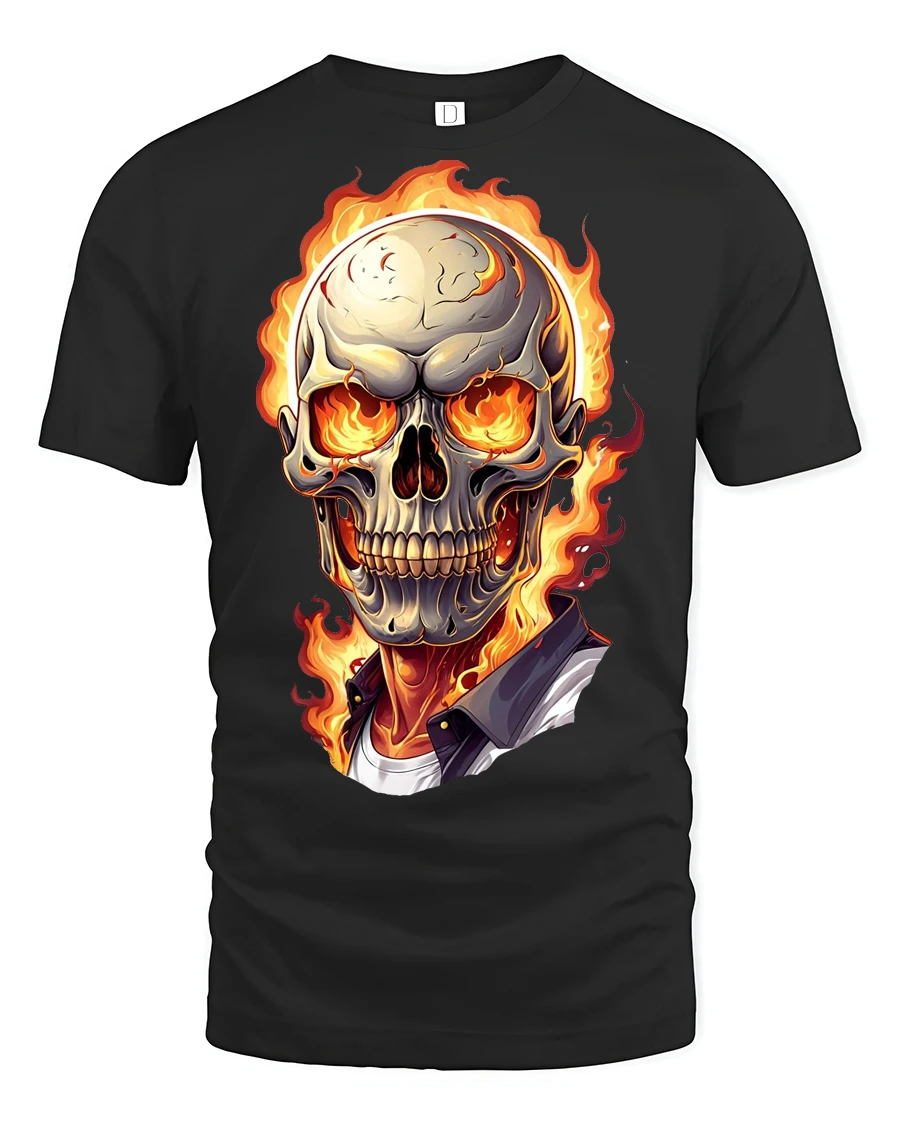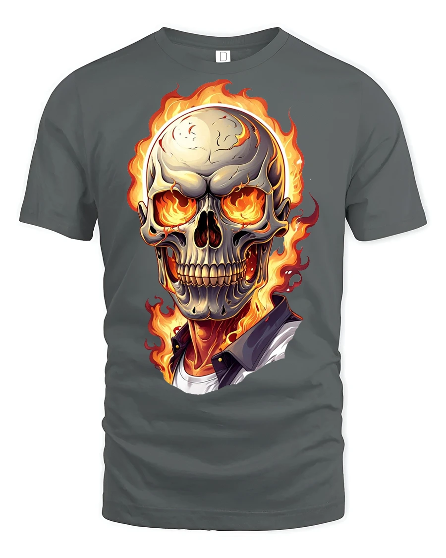 The fiery skull illustration creates a high impact design that looks great with jeans, jackets, or casual layered outfits.