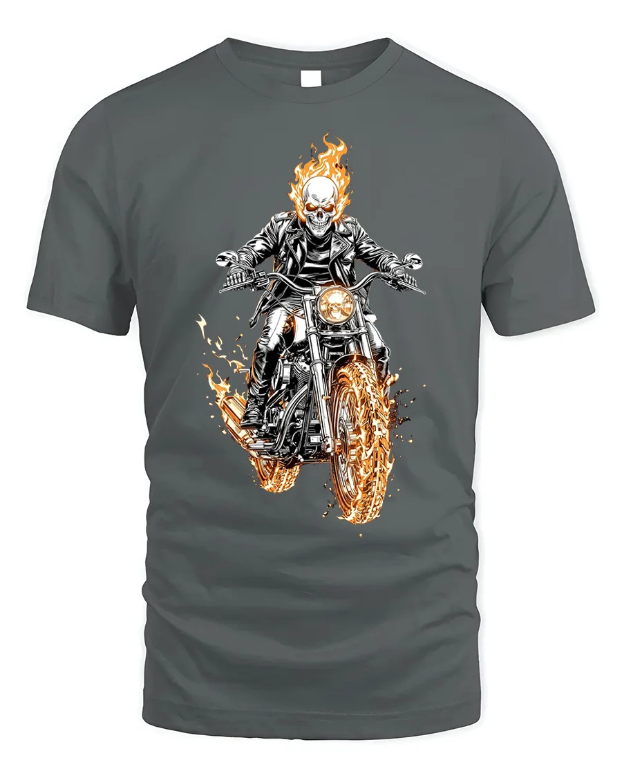 The Flaming Skull Rider Motorcycle Graphic T-Shirt is the ultimate statement piece for bikers, rock fans, and anyone who loves bold, edgy fashion. Featuring a fierce skull rider blazing down the road on a flaming motorcycle, this shirt delivers the perfect mix of gothic style and rebellious spirit. The fiery artwork is detailed and powerful, making it an instant attention-grabber at bike rallies, concerts, or casual nights out.
