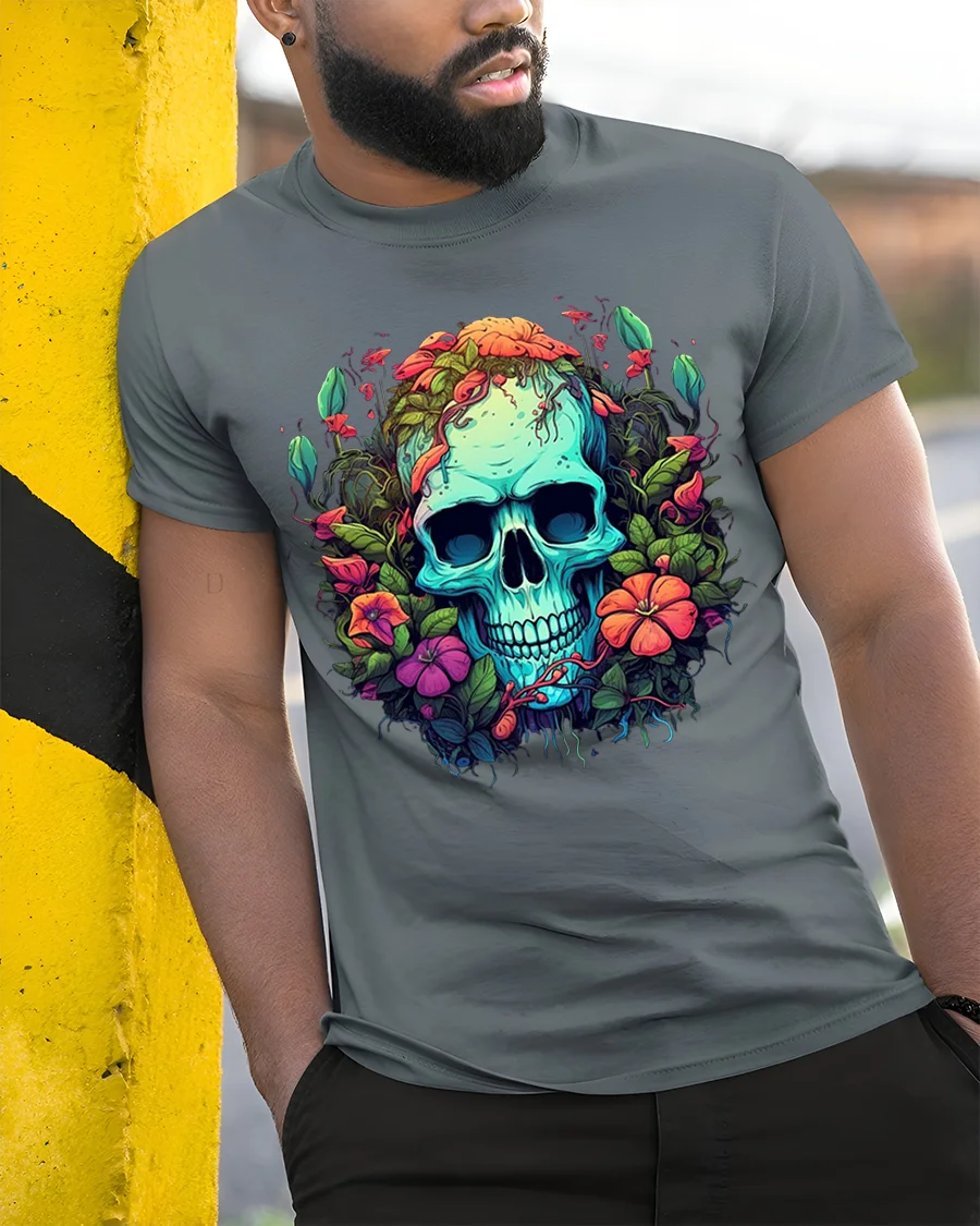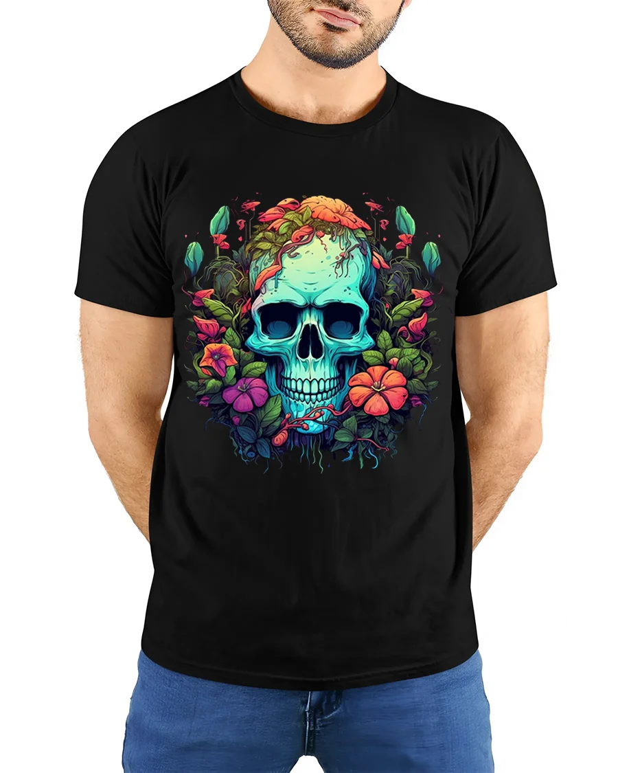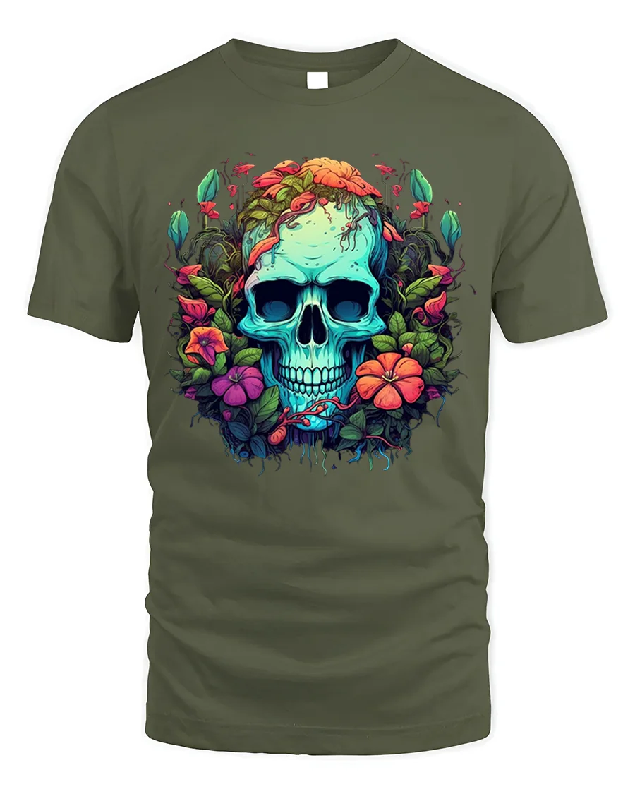 This Floral Skull Garden Art Colorful Graphic T-Shirt blends beauty and edge in one stunning design that symbolizes life, death, and rebirth. Made from a high-quality cotton blend, this soft and breathable t-shirt features a detailed skull surrounded by vibrant flowers and lush foliage, combining gothic style with natural elegance. The mix of bright colors and dark undertones creates a visually striking contrast that captures both strength and artistry.