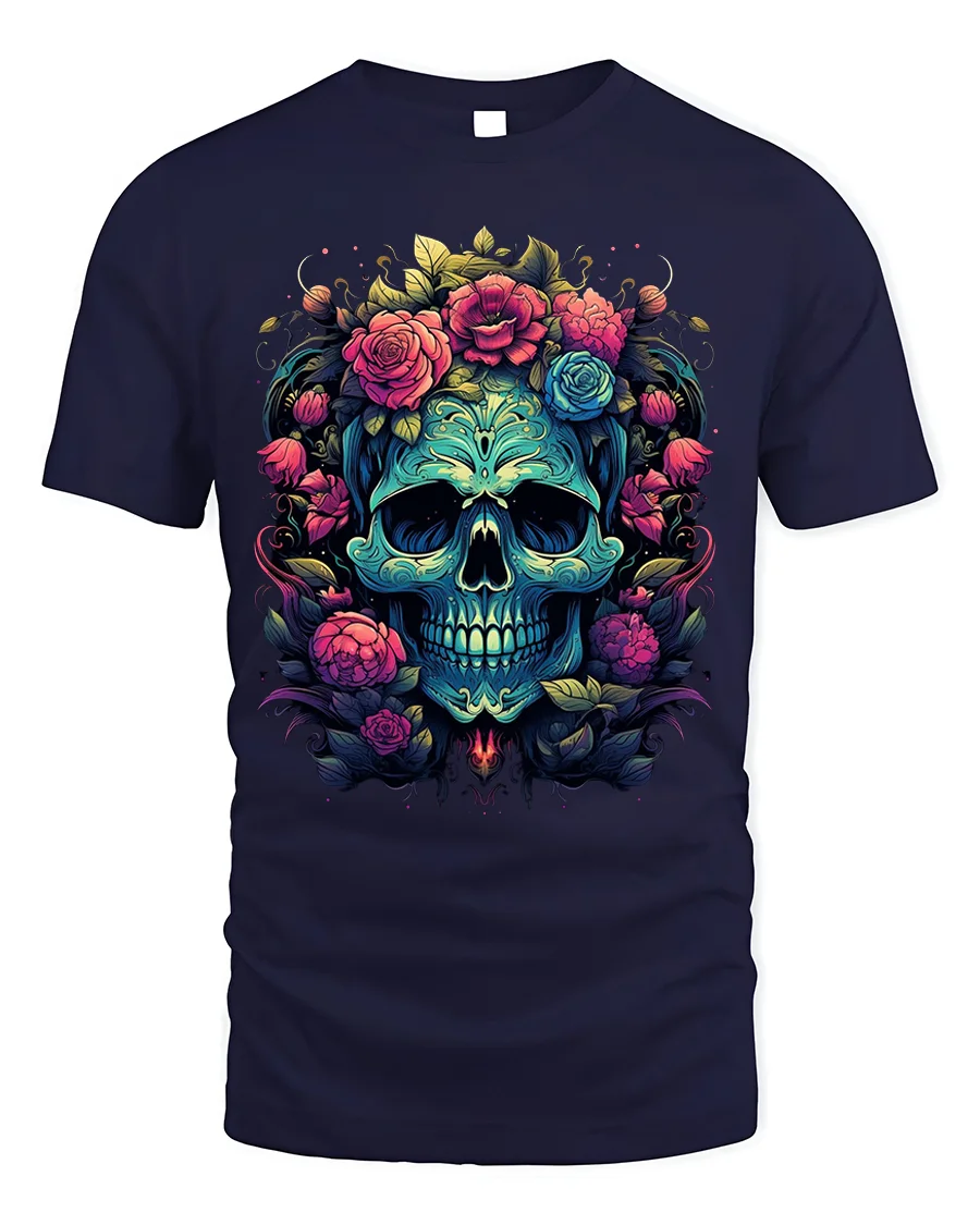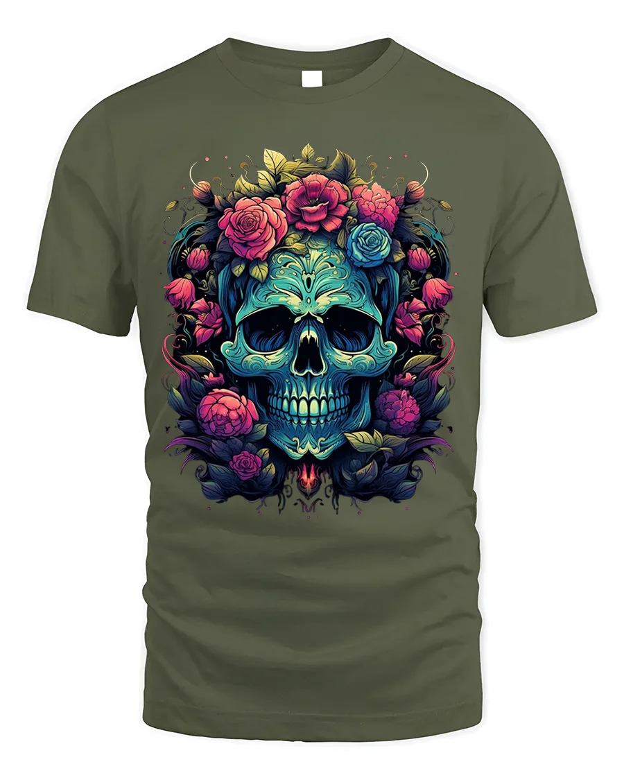 The Floral Sugar Skull Rose Art Graphic T-Shirt blends gothic beauty with vibrant artistic detail for a bold, unforgettable look. Crafted from a premium cotton blend, this tee offers exceptional comfort and durability, making it perfect for everyday wear. The stunning design features an intricately detailed skull surrounded by blooming roses and colorful leaves, symbolizing both life and mortality in a visually striking way.