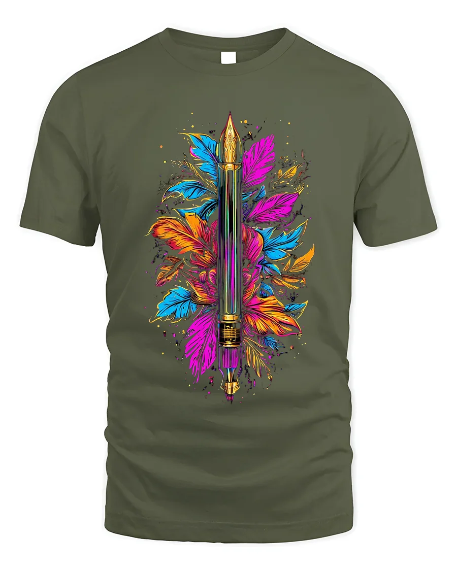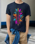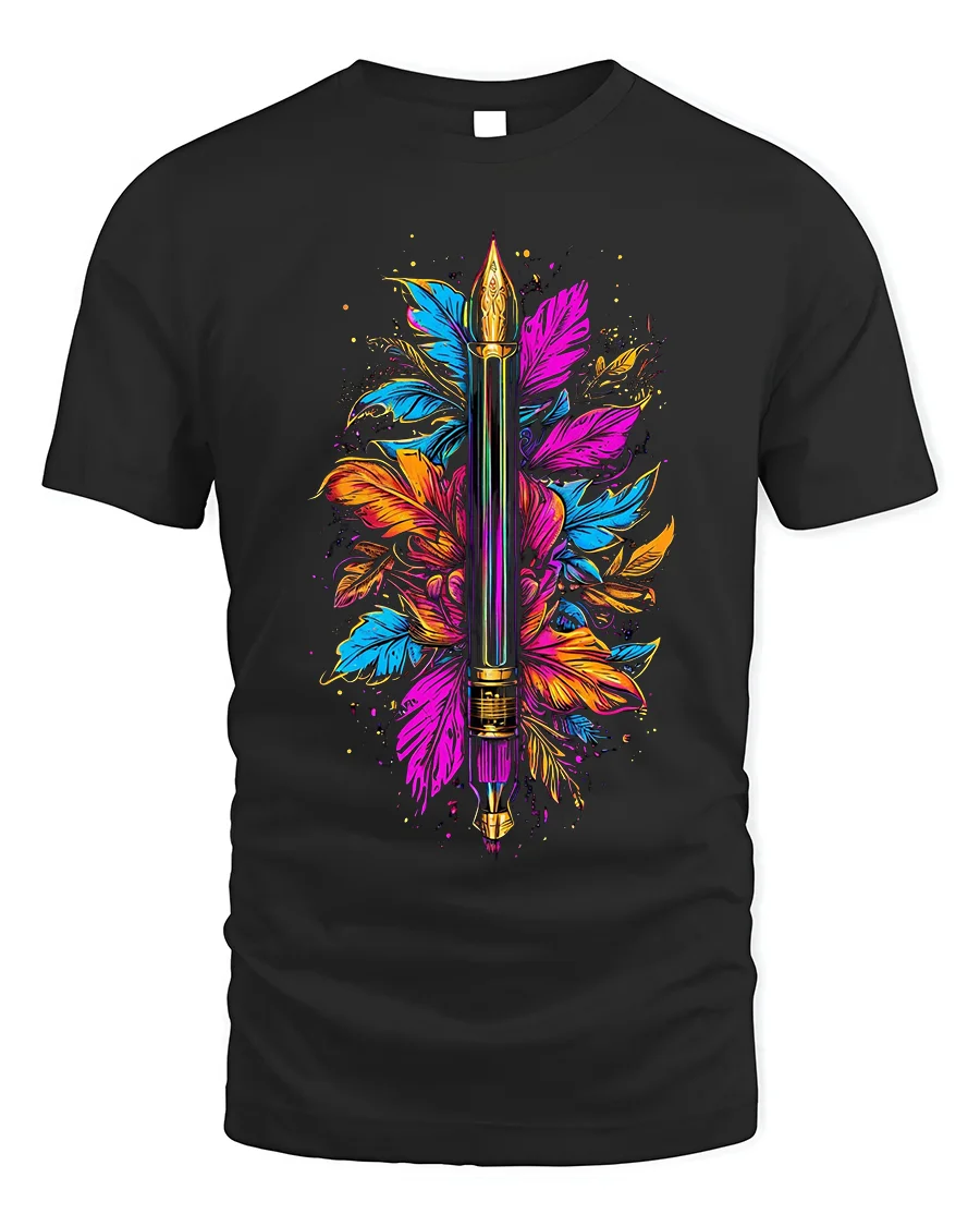 Celebrate creativity and the art of writing with our Fountain Pen & Colorful Feather Graphic T-Shirt. This stunning design features a classic fountain pen elegantly centered amidst a vibrant explosion of neon-hued feathers and leaves. It’s a beautiful metaphor for the flow of ideas and the colorful world of imagination, perfect for writers, artists, and dreamers alike.