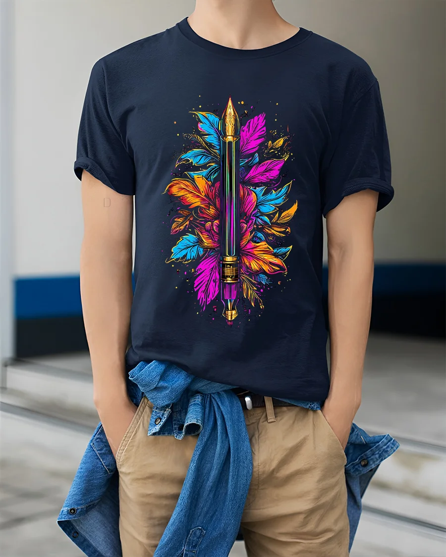 Crafted from premium, soft cotton, this Fountain Pen & Colorful Feather Graphic T-Shirt offers exceptional comfort and a relaxed fit for all-day wear. The breathable fabric feels gentle against your skin, making it an ideal choice for inspiring your next masterpiece or just enjoying a casual day. Our high-quality printing ensures the vivid colors and intricate details remain sharp and brilliant, wash after wash, resisting fading or cracking.