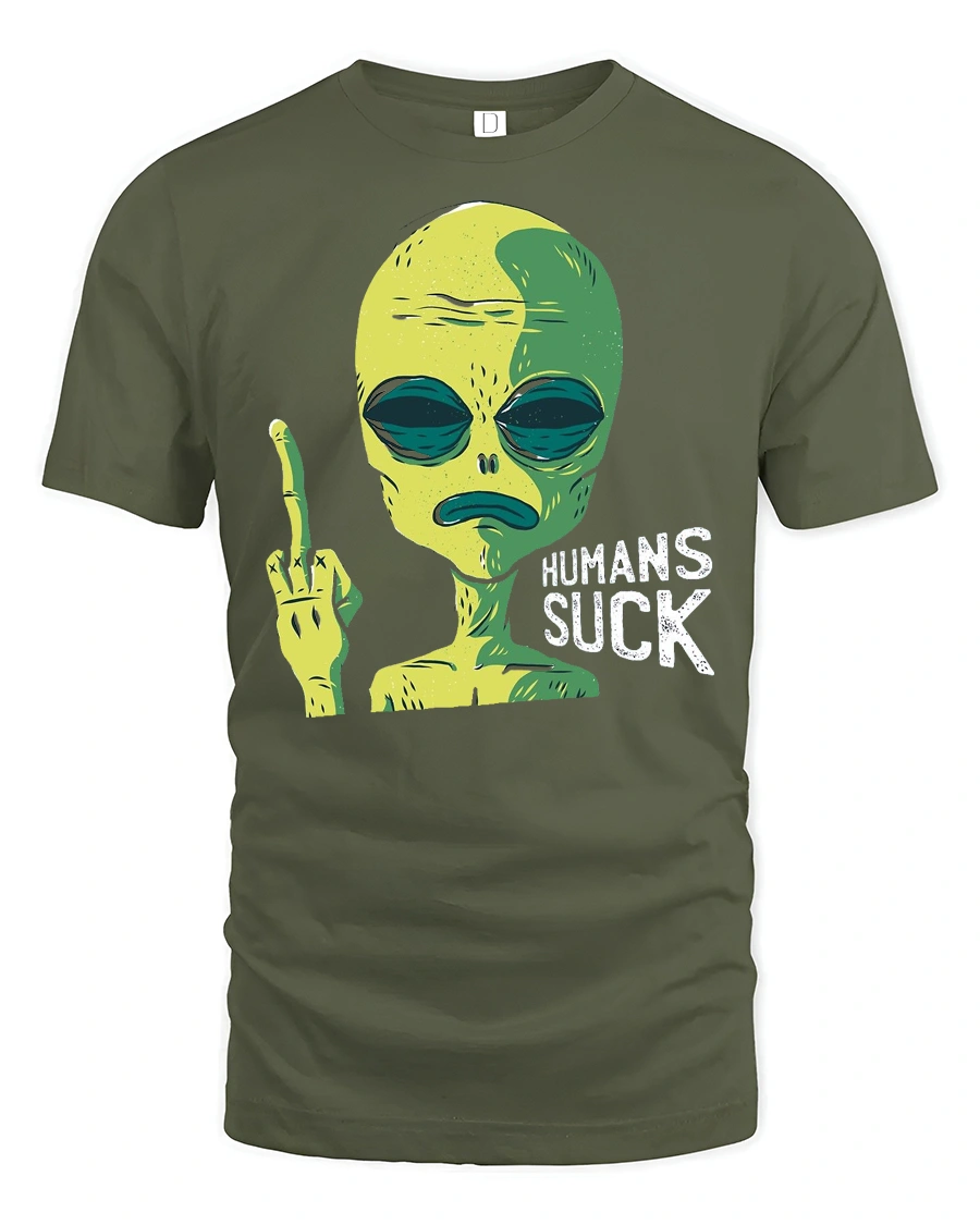 Funny Alien Humans Suck Graphic T Shirt Sarcastic Humor Tee - military green t-shirt on white background