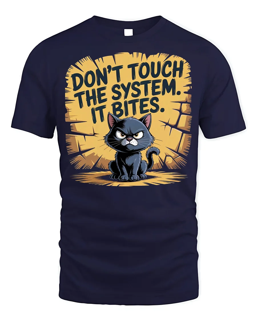 The Funny Angry Cat Don’t Touch System T-Shirt is perfect for anyone who loves humor, sarcasm, and cats with attitude. Featuring a grumpy cartoon cat alongside the bold message “Don’t Touch The System, It Bites,” this graphic tee combines funny cat art with a witty quote that makes it a standout piece in any wardrobe.