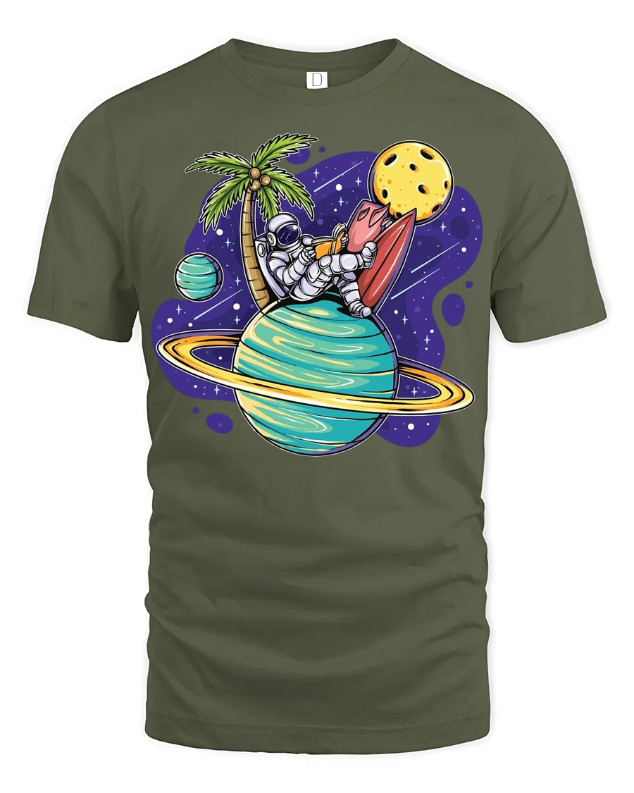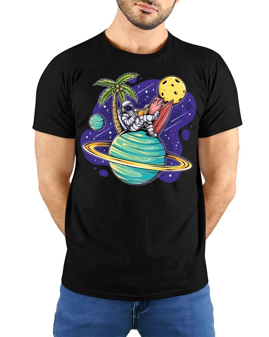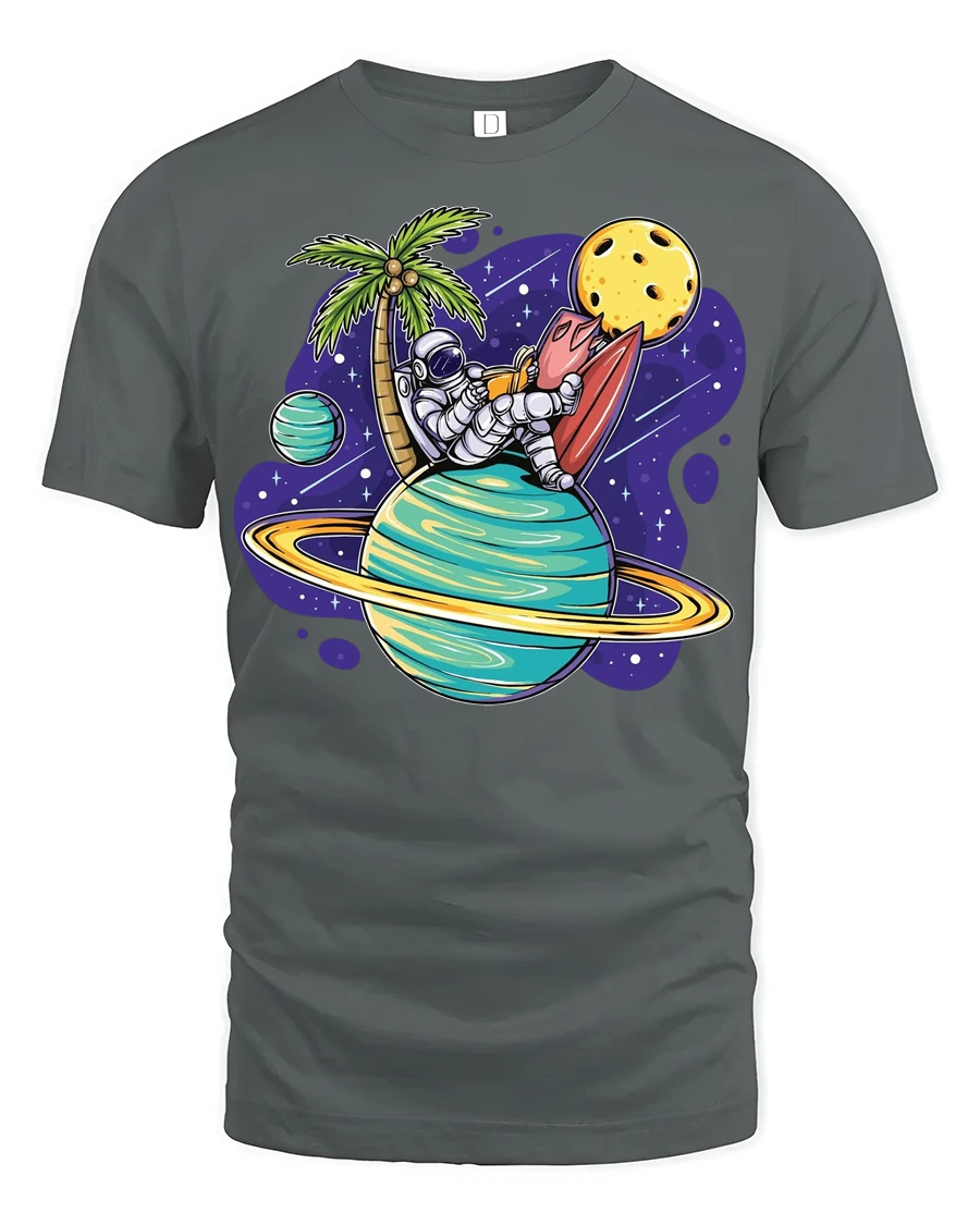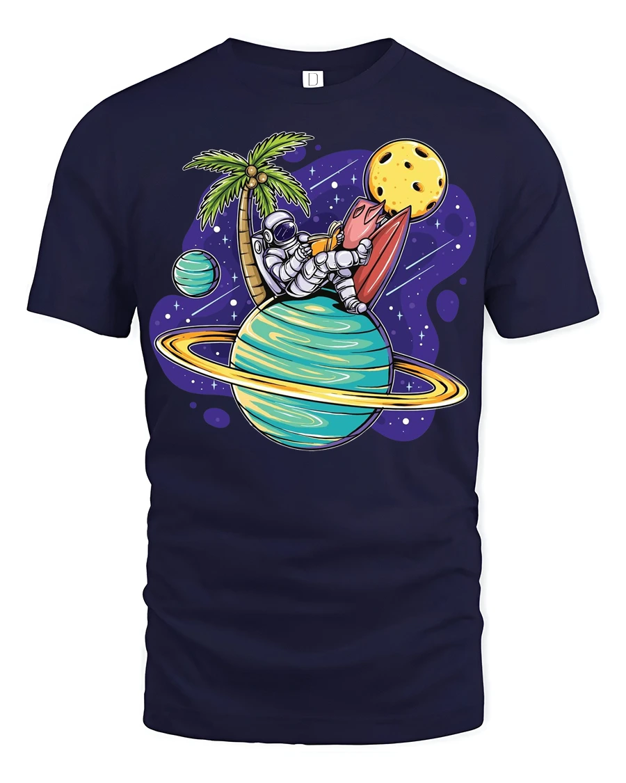 Funny Astronaut Surfing Planet Space Beach Vibes T Shirt blends cosmic adventure with relaxed beach energy in a playful and creative design.