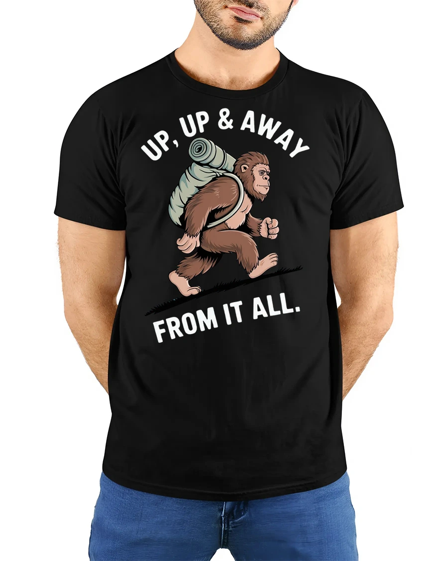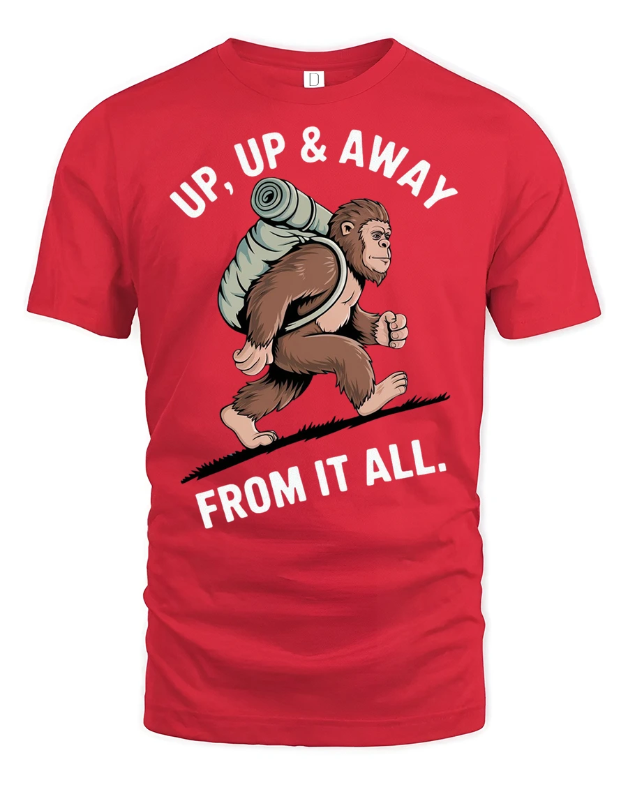 Funny Bigfoot Hiking Graphic Tee Up Up And Away Tshirt features a humorous illustration of a backpacking sasquatch heading into the wilderness with a playful adventurous spirit. The creative design combines outdoor lifestyle inspiration with lighthearted humor, creating an engaging graphic that connects with people who enjoy hiking, camping, and nature exploration. This fun concept adds personality and charm to everyday casual style.