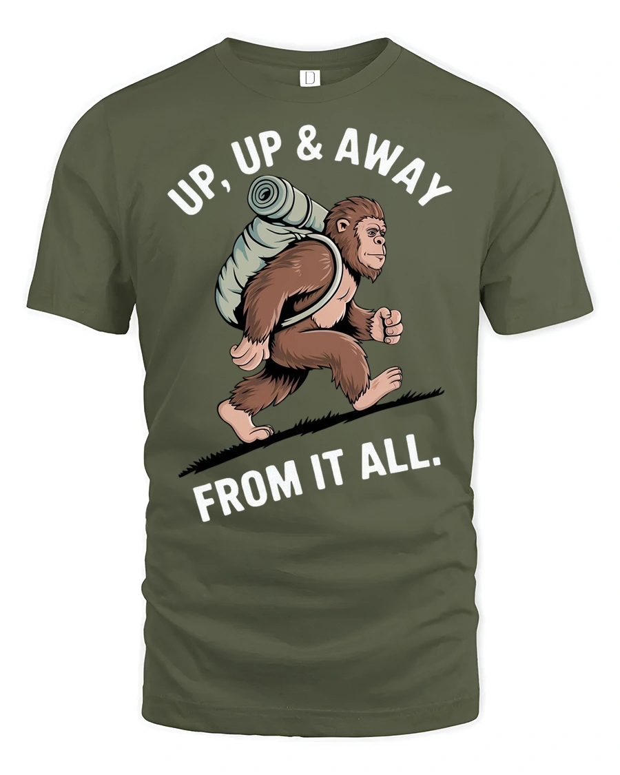 Funny Bigfoot Hiking Graphic Tee Up Up And Away Tshirt - military green t-shirt on white background