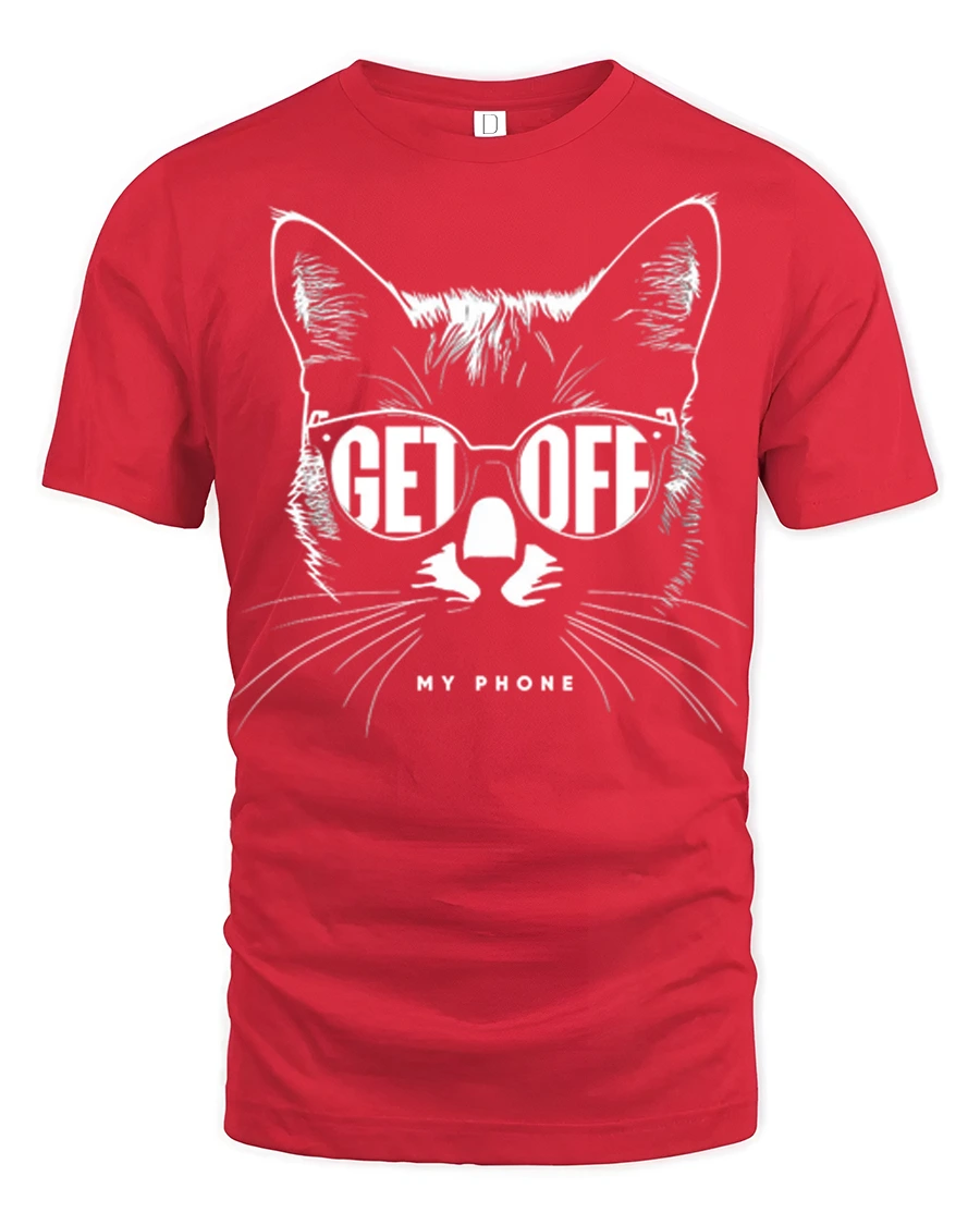 Funny Cat Get Off My Phone Graphic T Shirt Cool Cat Humor - red t-shirt on white background