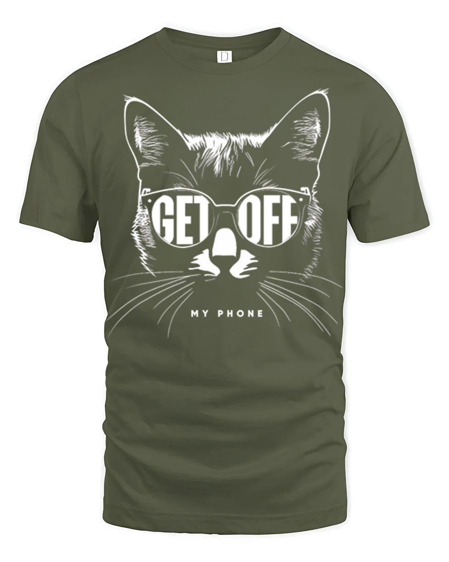 Funny Cat Get Off My Phone Graphic T Shirt Cool Cat Humor - military green t-shirt on white background