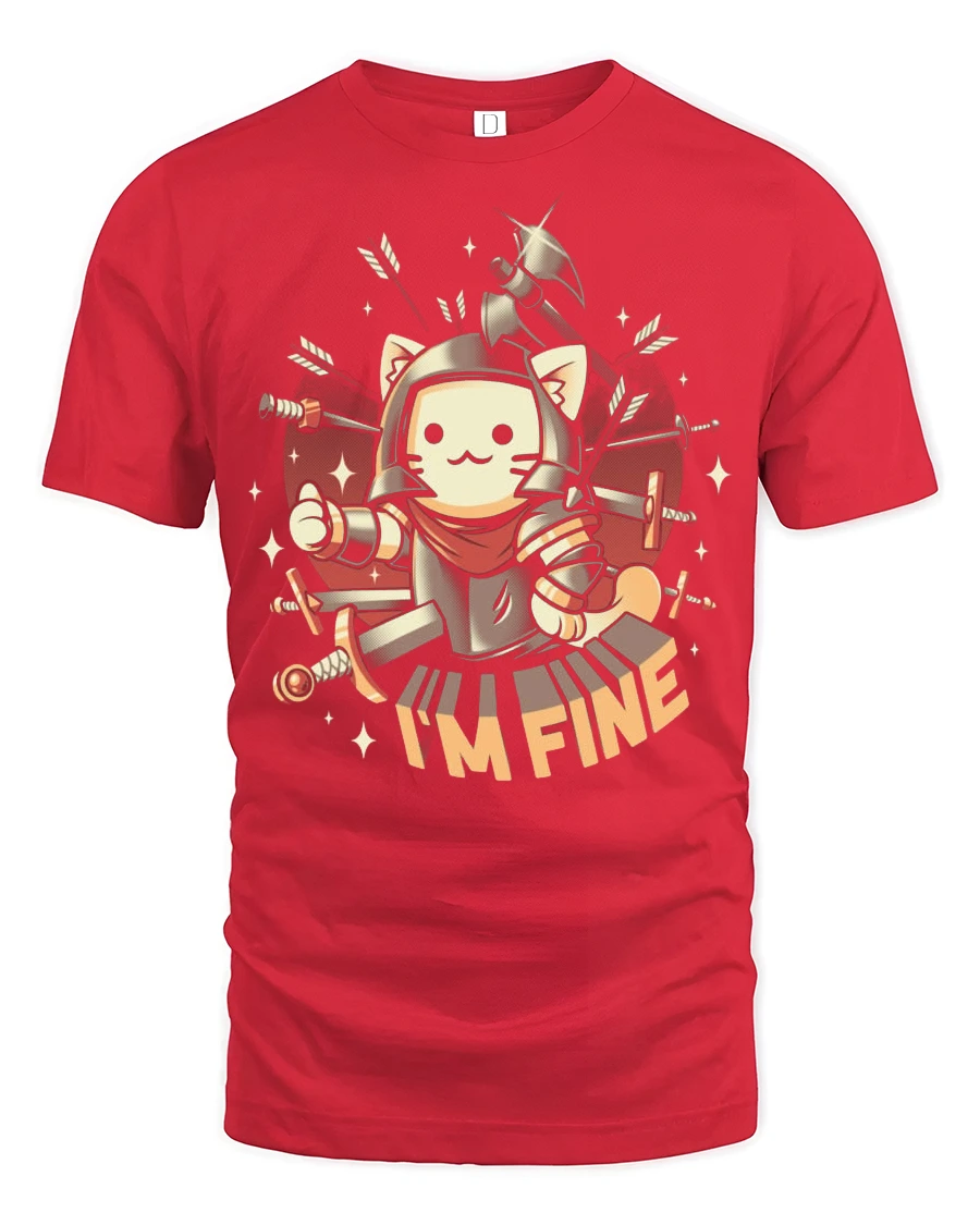 Funny Cat Knight Im Fine Graphic Tee Cute Warrior Humor Tshirt - red t-shirt on white background