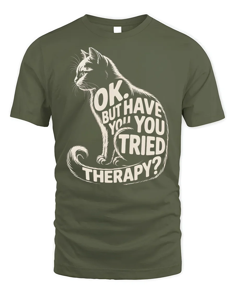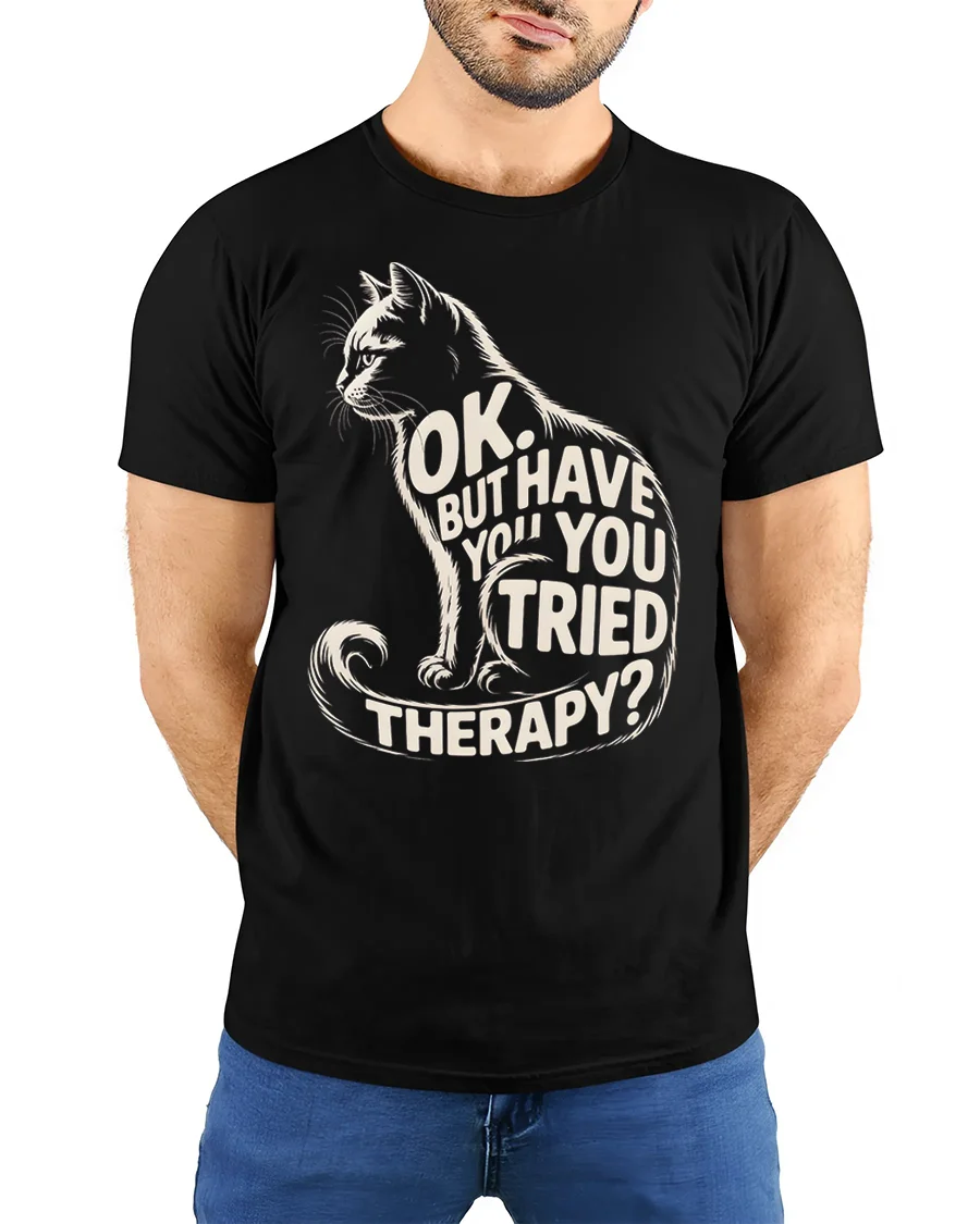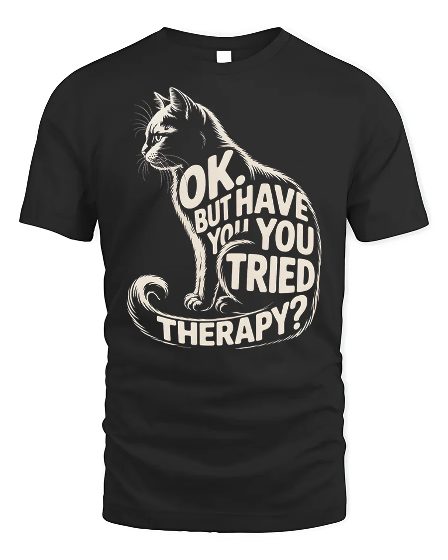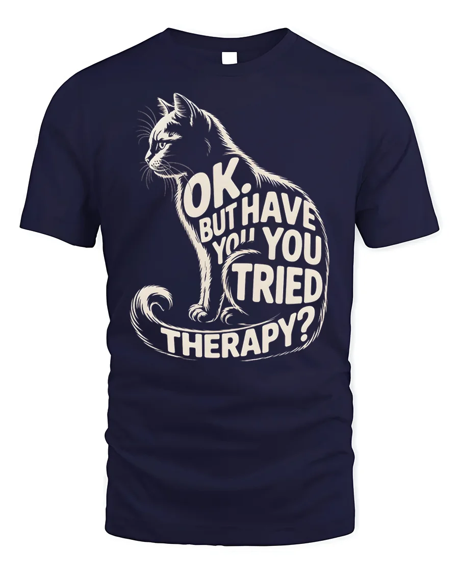 Add some sass and humor to your wardrobe with the Funny Cat Therapy Quote Sarcastic Graphic T-Shirt, a bold design that combines feline attitude with a witty message. Featuring a stylish cat silhouette filled with the quote “OK. But Have You Tried Therapy?”, this shirt is perfect for those who appreciate dark humor, sarcasm, and a touch of cat-inspired wit.