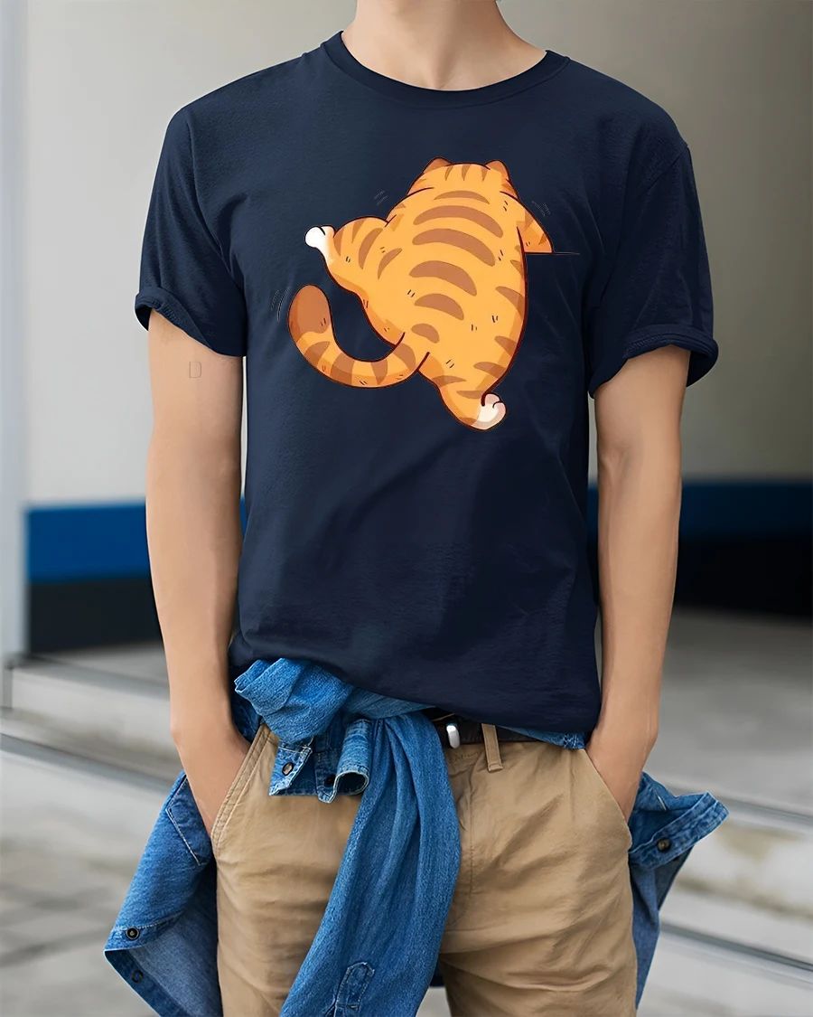Funny Chubby Cat Butt Wiggle Cute Cartoon Graphic T Shirt - model wearing navy tee with hands in pockets