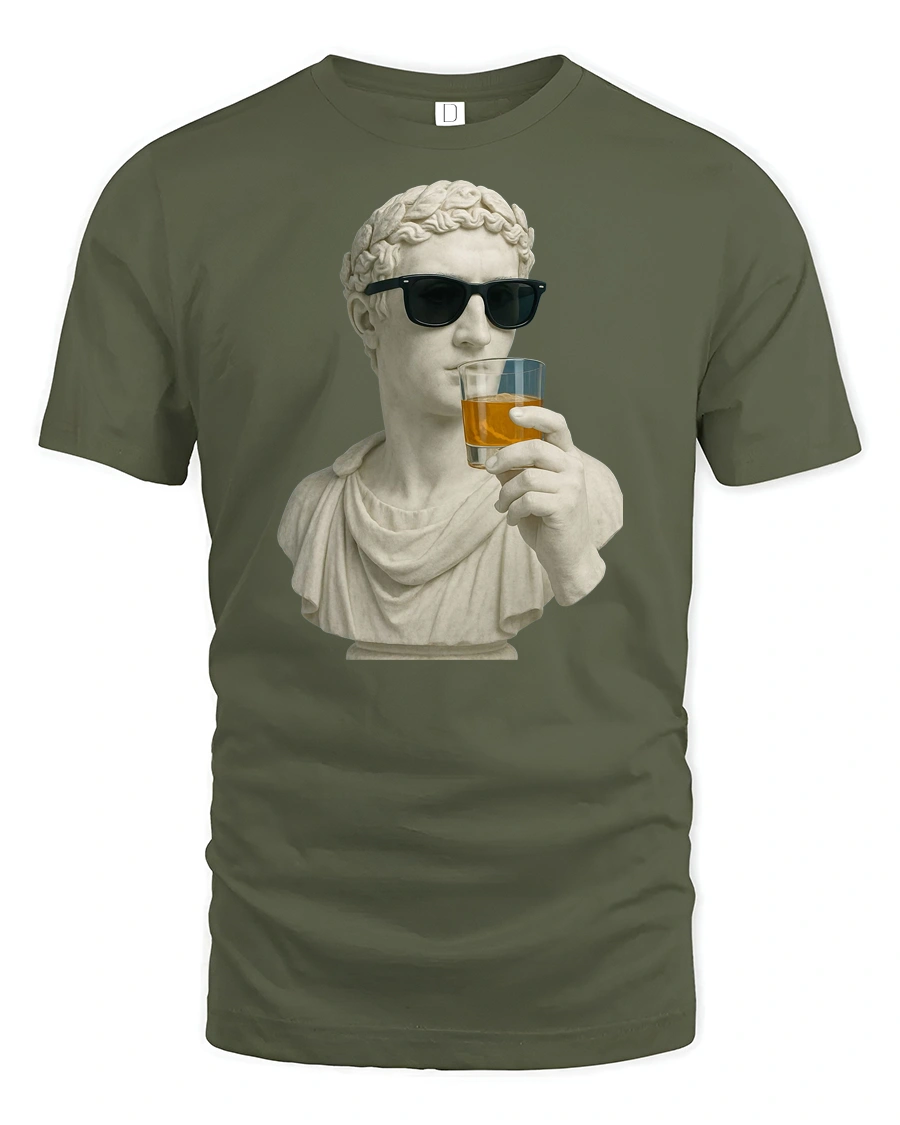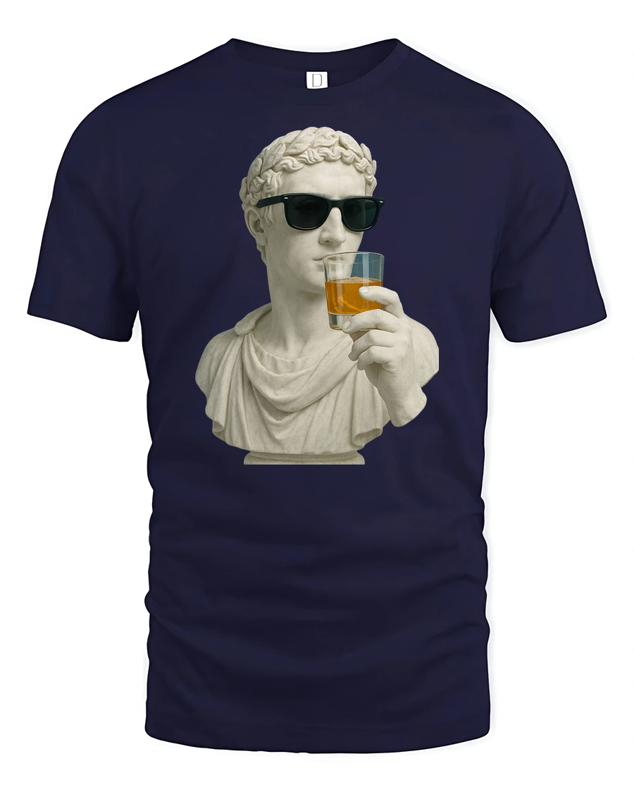 Funny Classical Statue Drinking Whiskey Cool Sunglasses T Shirt blends timeless art with modern humor in a bold and stylish design.