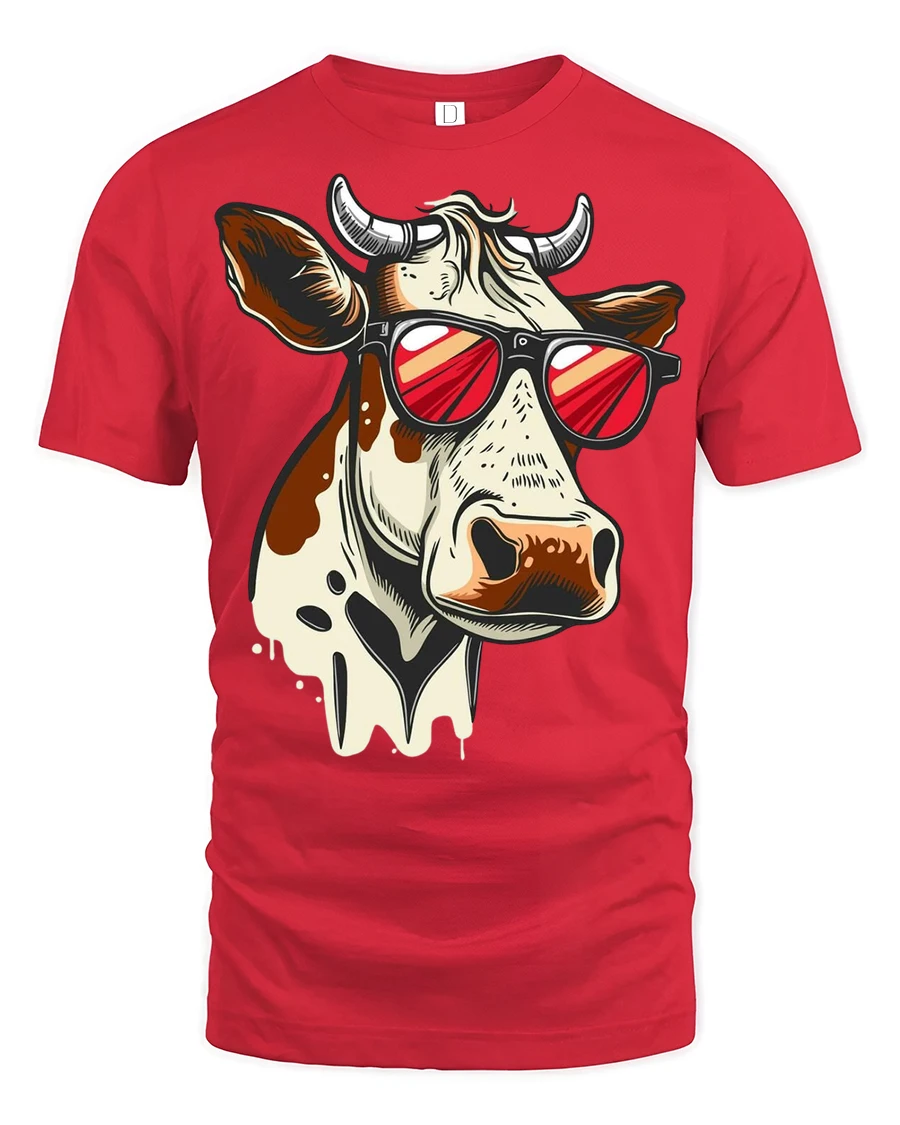 Funny Cool Cow With Sunglasses Graphic T Shirt Farm Humor Tee - red t-shirt on white background