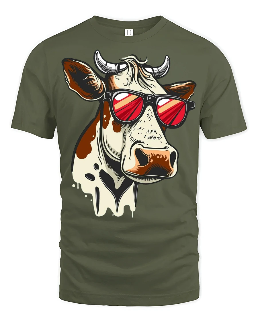 Funny Cool Cow With Sunglasses Graphic T Shirt Farm Humor Tee - military green t-shirt on white background