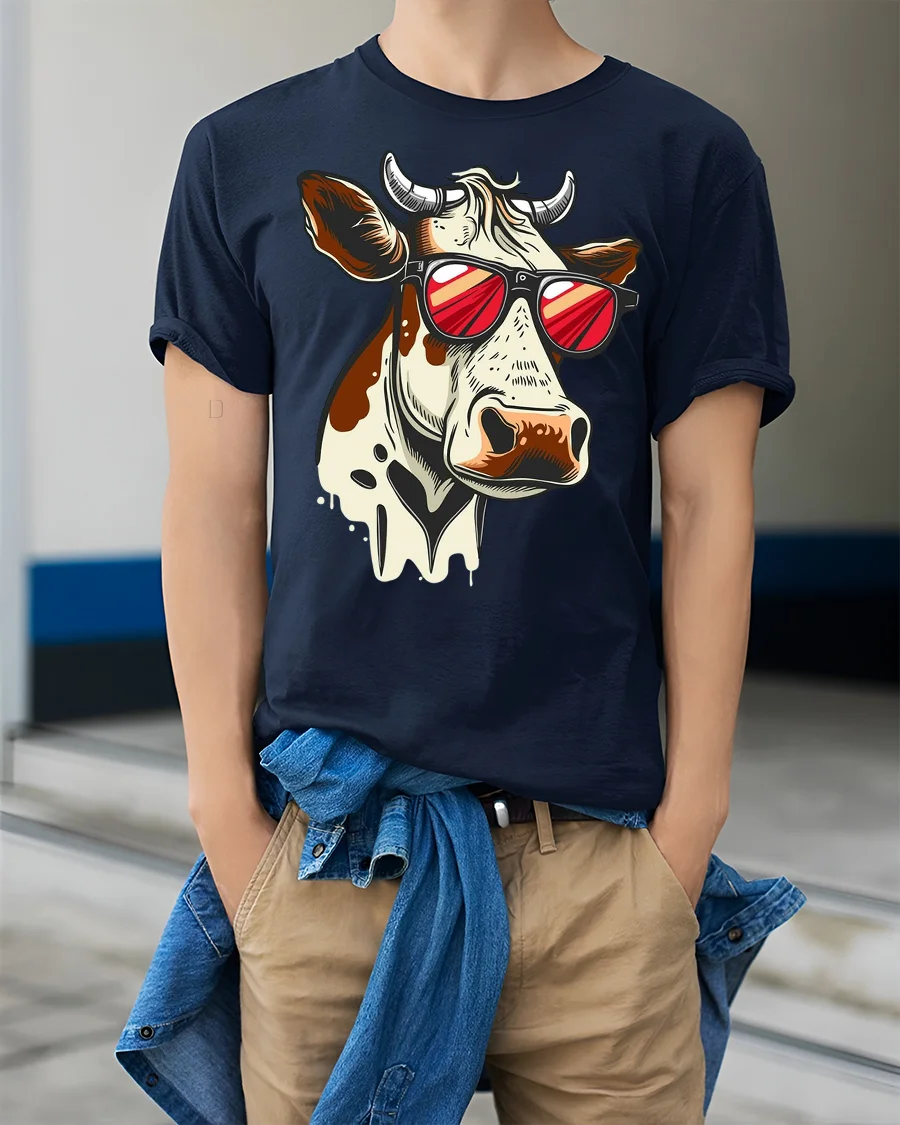 Funny Cool Cow With Sunglasses Graphic T Shirt Farm Humor Tee - navy t-shirt on white background