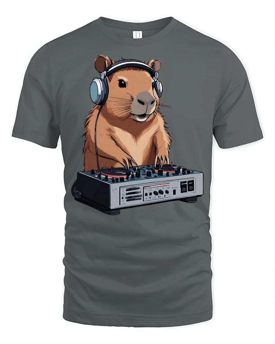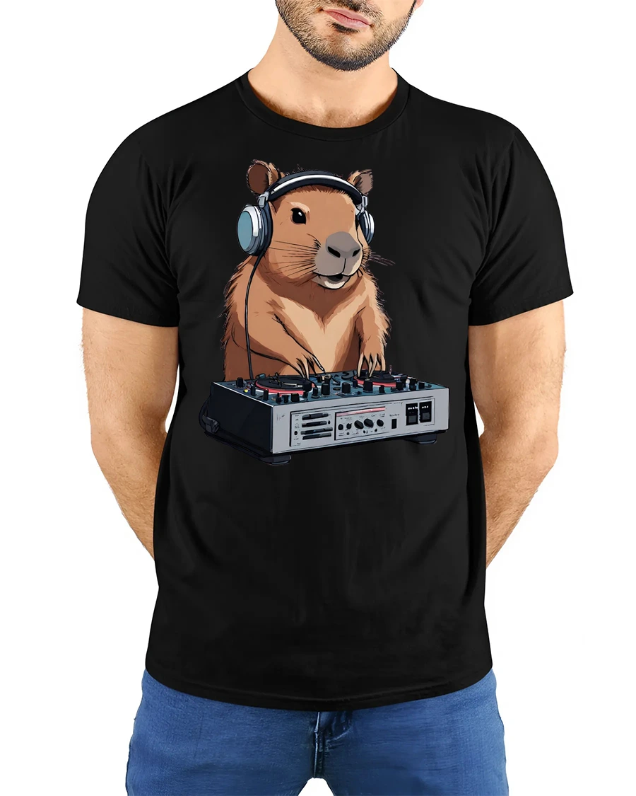 Funny DJ Capybara Music Lover Animal Graphic Tee Tshirt showcases a playful illustration of a capybara enjoying music while mixing tracks in a creative cartoon inspired artistic style.