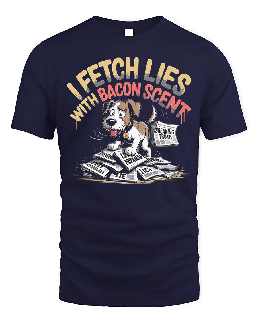 The Funny Dog I Fetch Lies With Bacon Scent T-Shirt is a playful and witty design that’s perfect for dog lovers with a sense of humor. Featuring a cartoon dog happily sniffing through newspapers marked with “lies” and “truth,” this shirt combines clever wordplay with a fun illustration. With bold text that reads “I Fetch Lies With Bacon Scent,” it’s a lighthearted tee that will get laughs at parties, casual gatherings, or everyday wear.