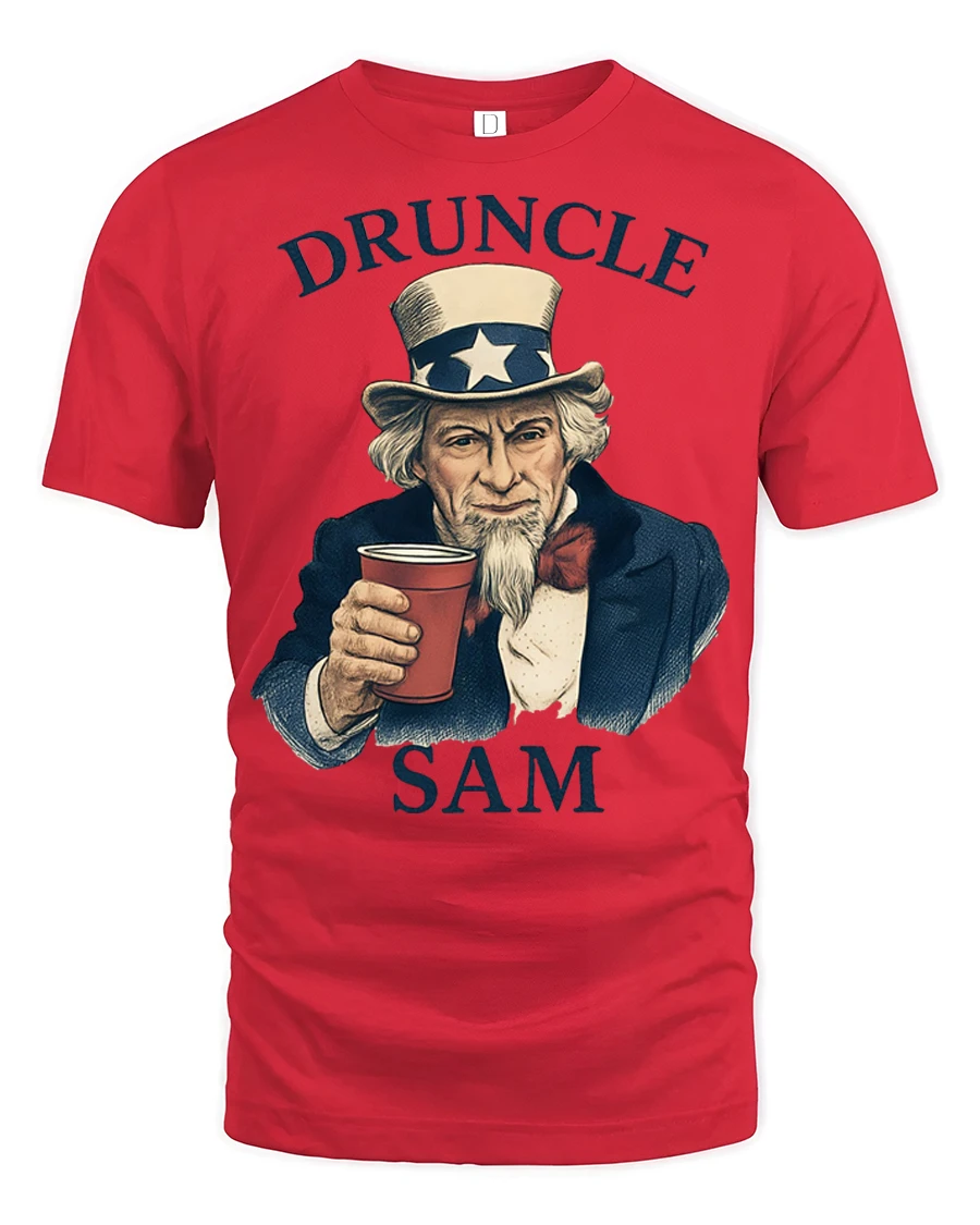The artwork features a humorous version of Uncle Sam holding a party cup while the phrase Druncle Sam adds a clever and lighthearted patriotic joke.