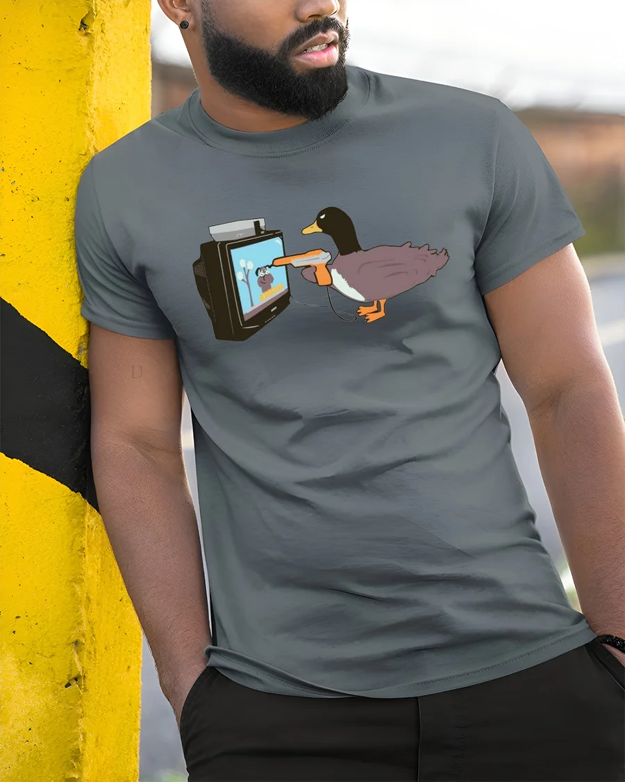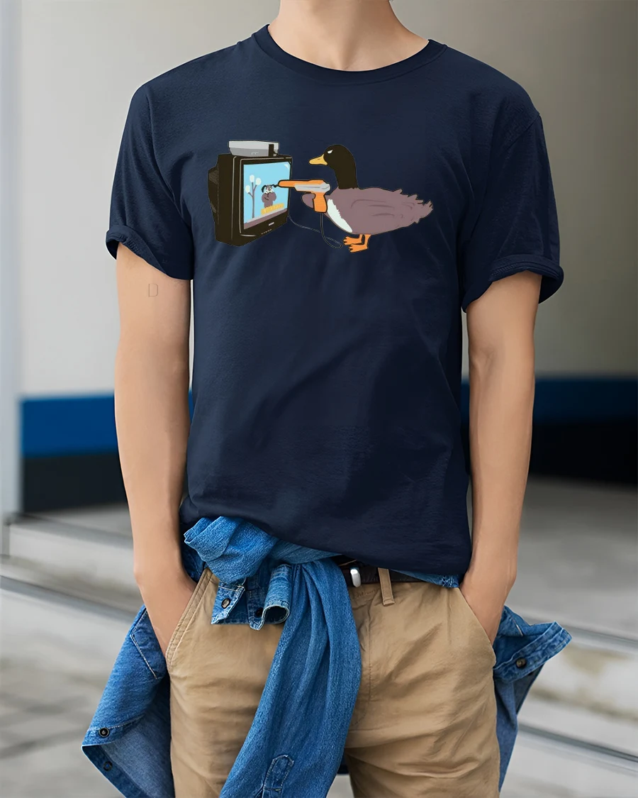 This tshirt provides a comfortable feel suitable for casual outfits, relaxed gaming sessions, social gatherings, or expressive everyday fashion. The gamer duck artwork symbolizes creativity and appreciation for classic entertainment themes, while the humorous illustration adds personality and playful mood. Its versatile visual style pairs easily with modern casual clothing, helping express confident and relaxed style identity.