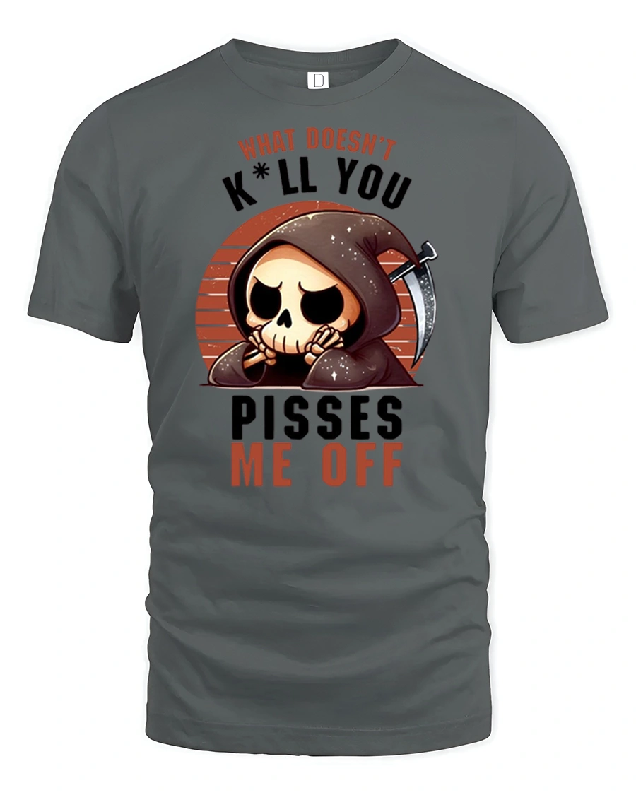 This funny grim reaper what doesnt kill you pisses me off graphic t shirt brings bold dark humor and sarcastic attitude into a unique and eye catching design. The artwork features a grumpy cartoon grim reaper with a scythe and an annoyed expression, perfectly matching the hilarious quote that flips a classic motivational phrase into something far more sarcastic. The combination of spooky character design and witty humor creates a memorable graphic that instantly stands out.
