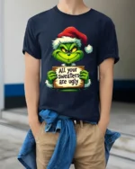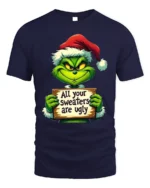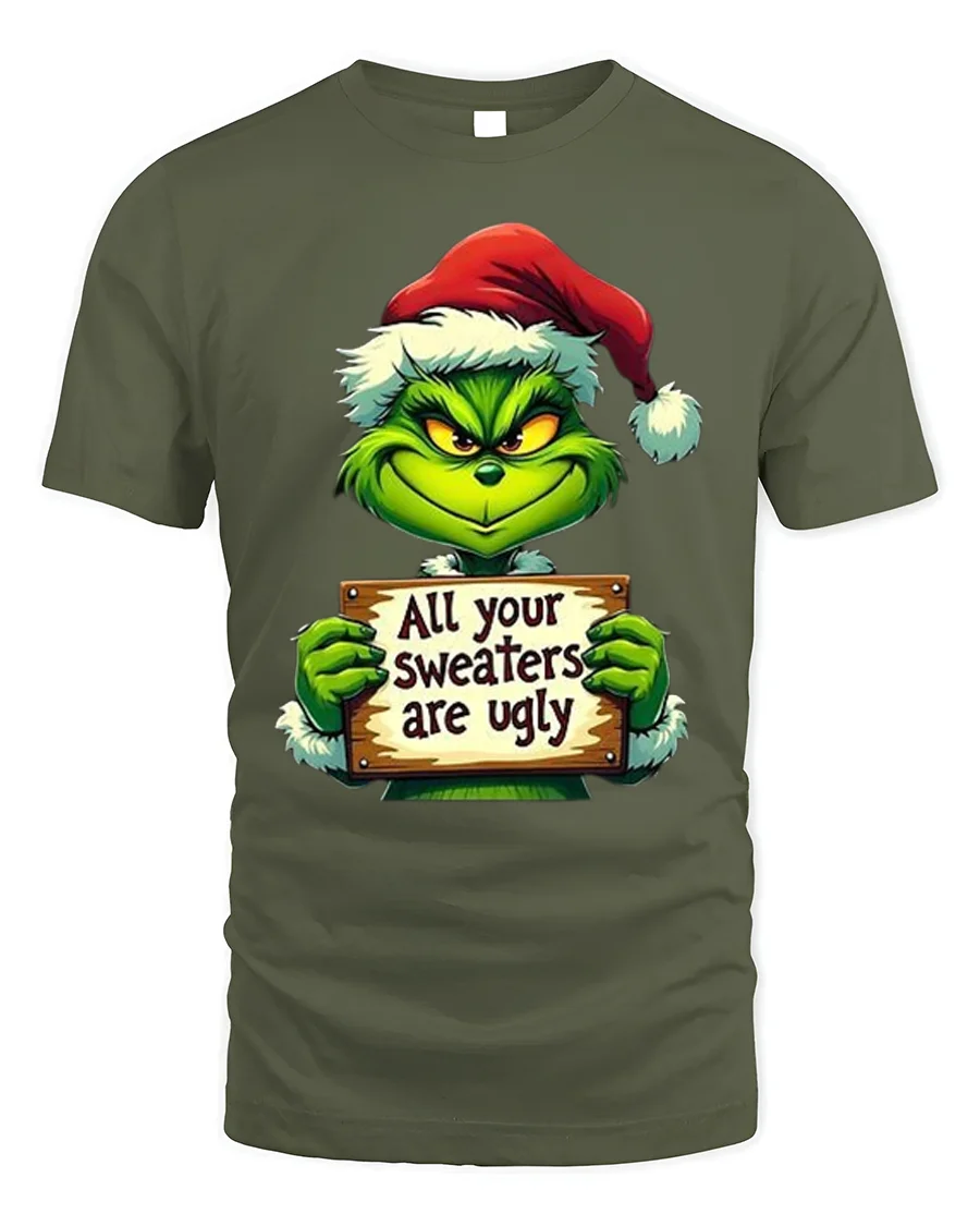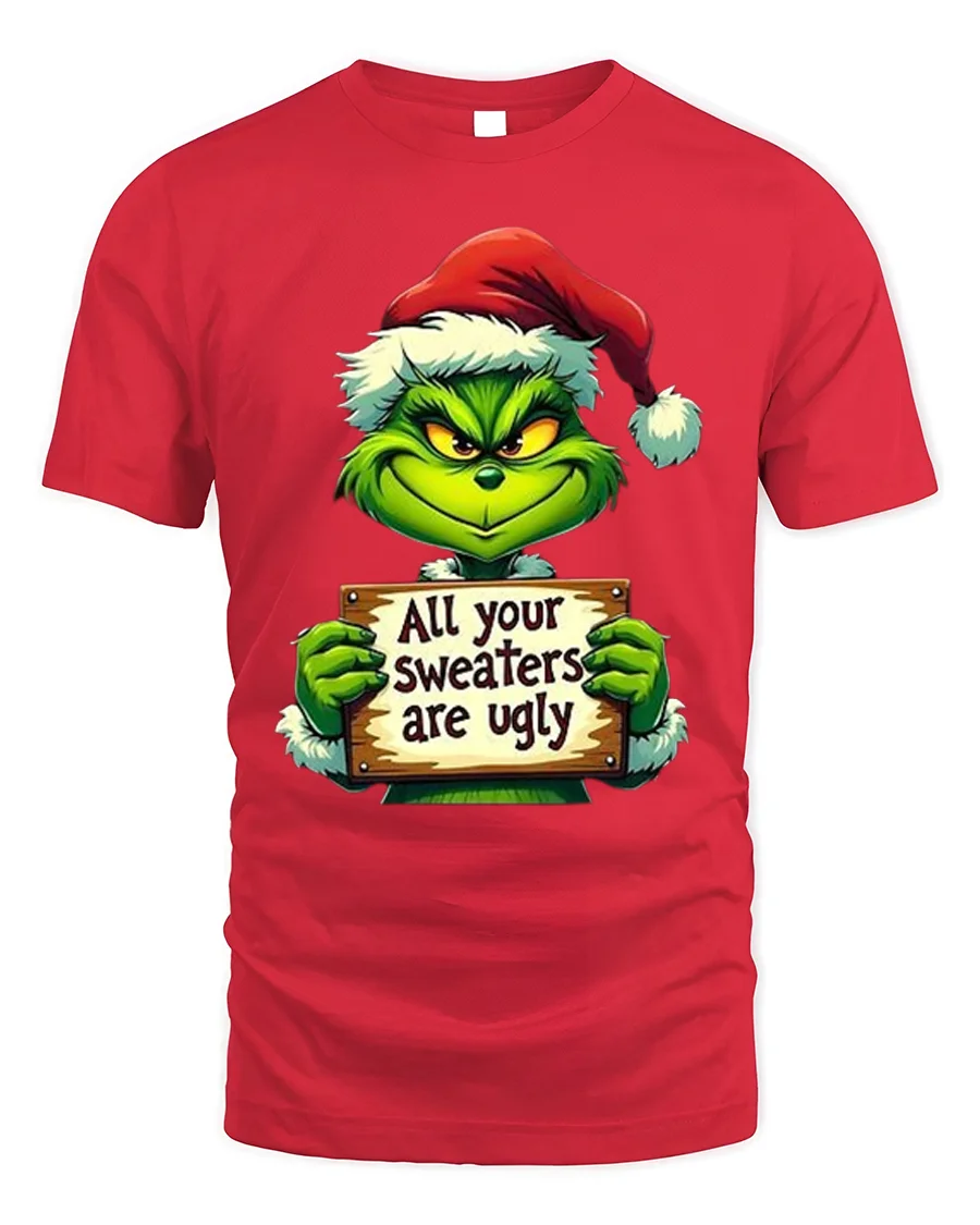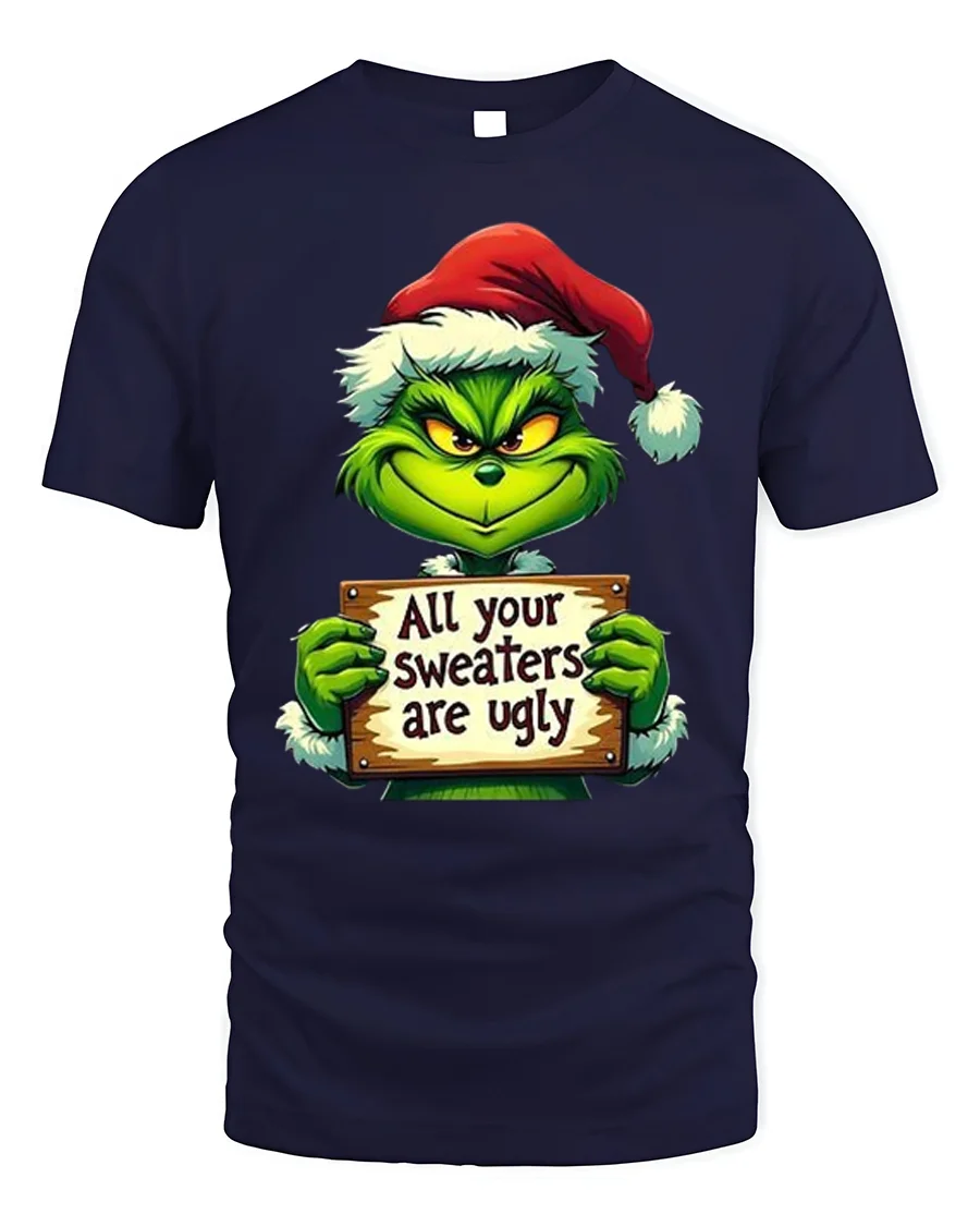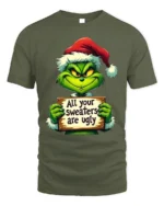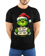 Show off your sarcastic holiday spirit with the Funny Grinch All Your Sweaters Are Ugly Christmas T-Shirt. Featuring a mischievous green character in a Santa hat holding a sign that declares “All your sweaters are ugly,” this hilarious design perfectly captures the playful side of Christmas. It’s the ultimate tee for anyone who loves humor and wants to stand out at ugly sweater parties.