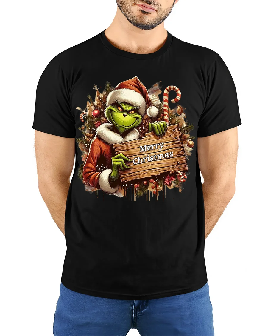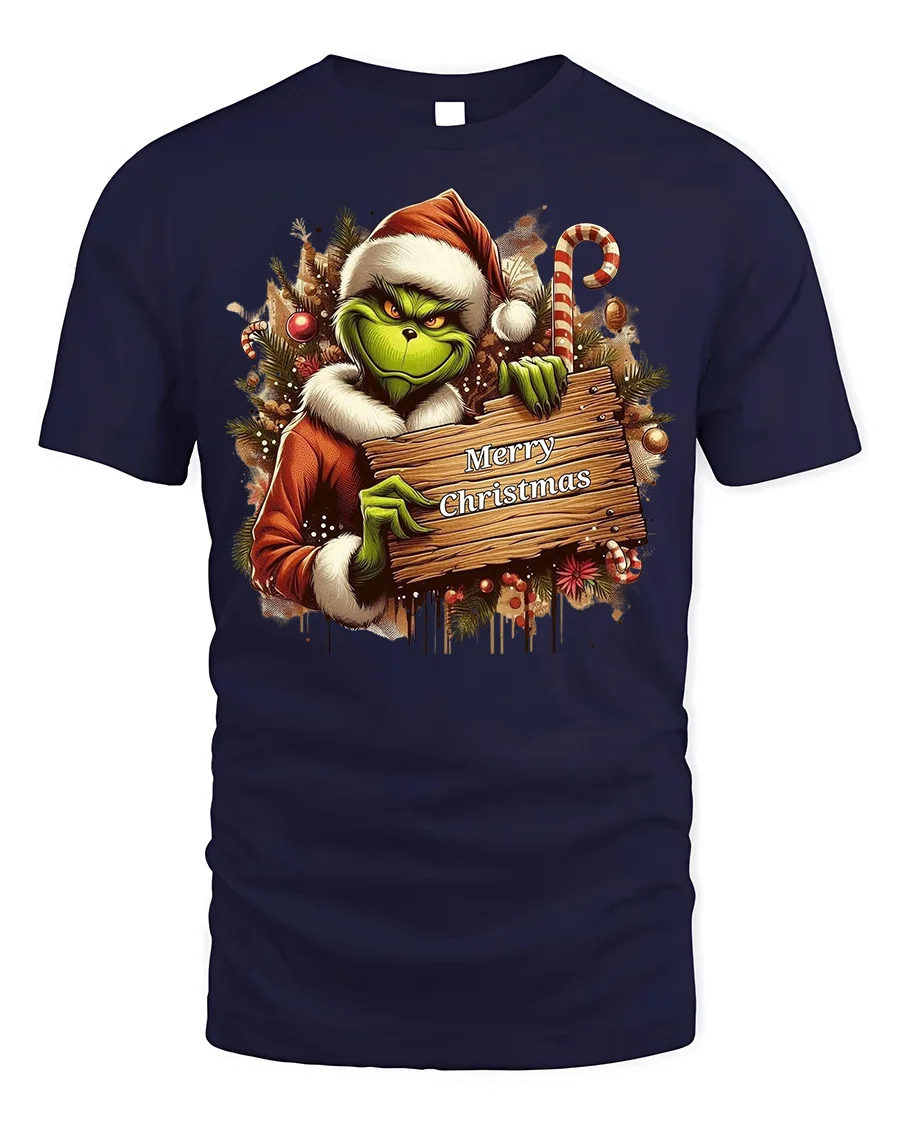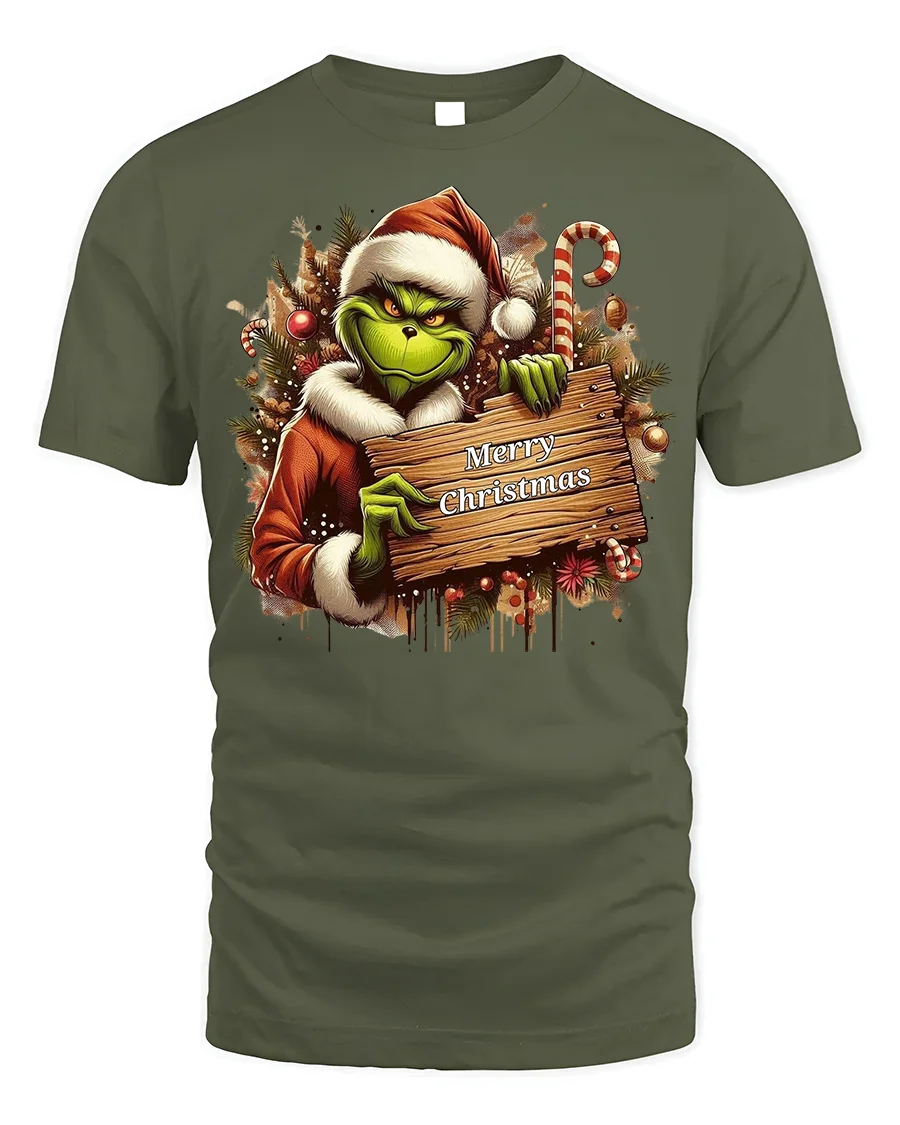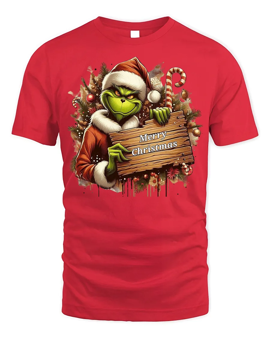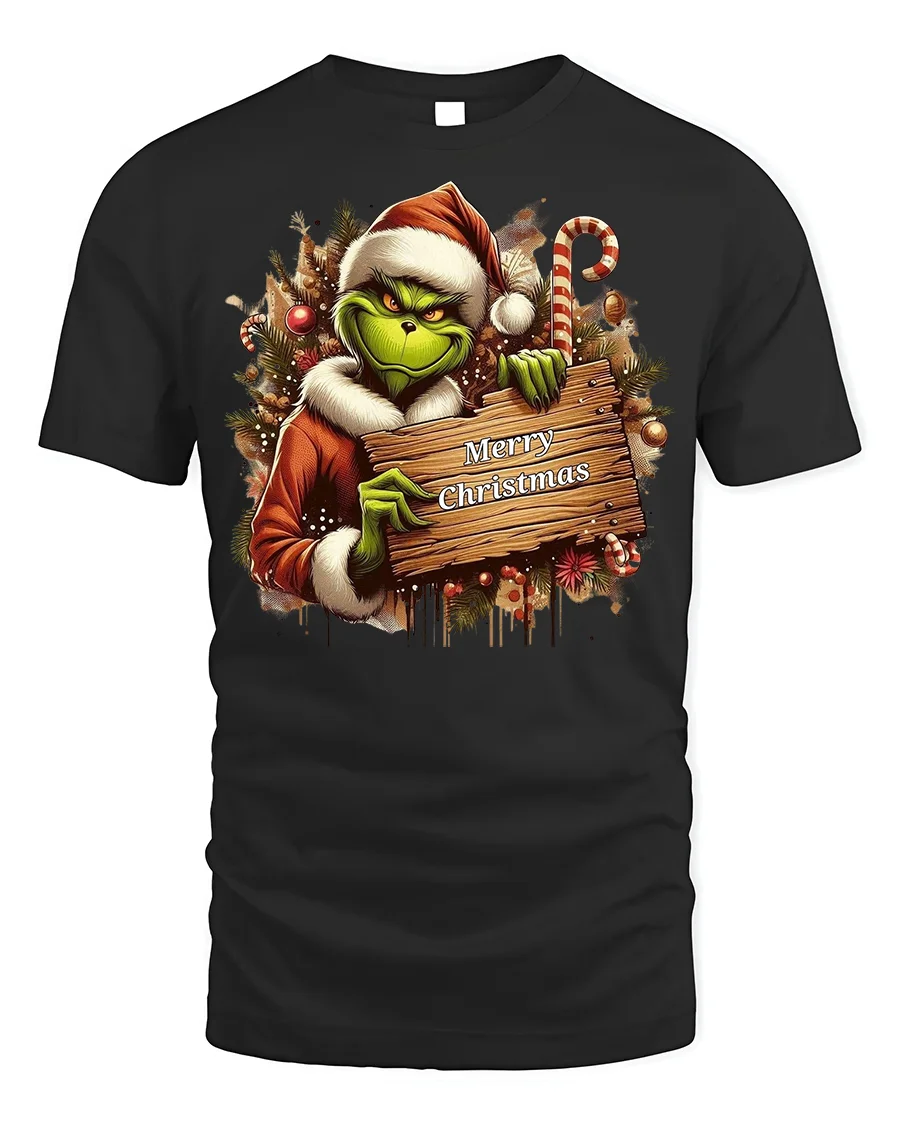Funny Grinch Merry Christmas Holiday T-Shirt is the perfect choice for anyone who loves to add humor to their holiday celebrations. Featuring the iconic green character dressed as Santa Claus, holding a wooden sign that says “Merry Christmas,” this playful design captures the fun and mischievous spirit of the season. Surrounded by candy canes, ornaments, and festive lights, it’s a bold and cheerful design that spreads holiday joy with a twist of comedy.
