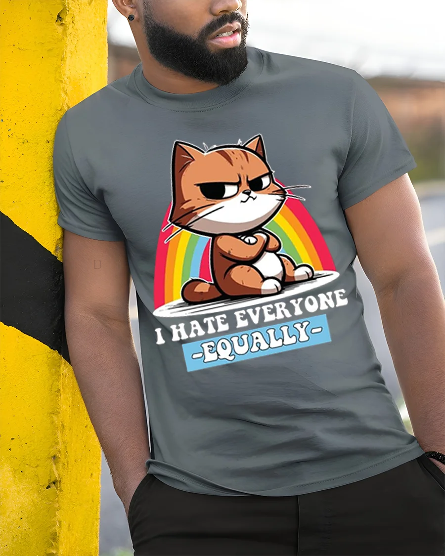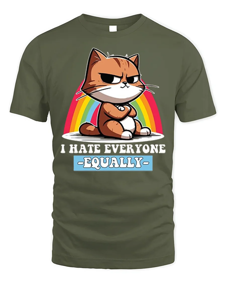 Bring some humor and attitude to your wardrobe with the Funny Grumpy Cat I Hate Everyone Equally T-Shirt. Featuring a cartoon grumpy cat with folded arms in front of a colorful rainbow, this bold graphic tee delivers the perfect mix of sarcasm and cuteness. The witty phrase “I Hate Everyone Equally” makes it a standout piece for anyone with a playful sense of humor and a love for cats.