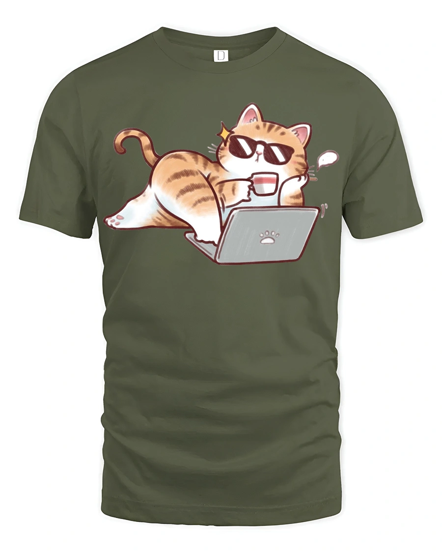 Funny Lazy Cat Working From Home Cartoon Graphic Tee Tshirt - military green t-shirt on white background