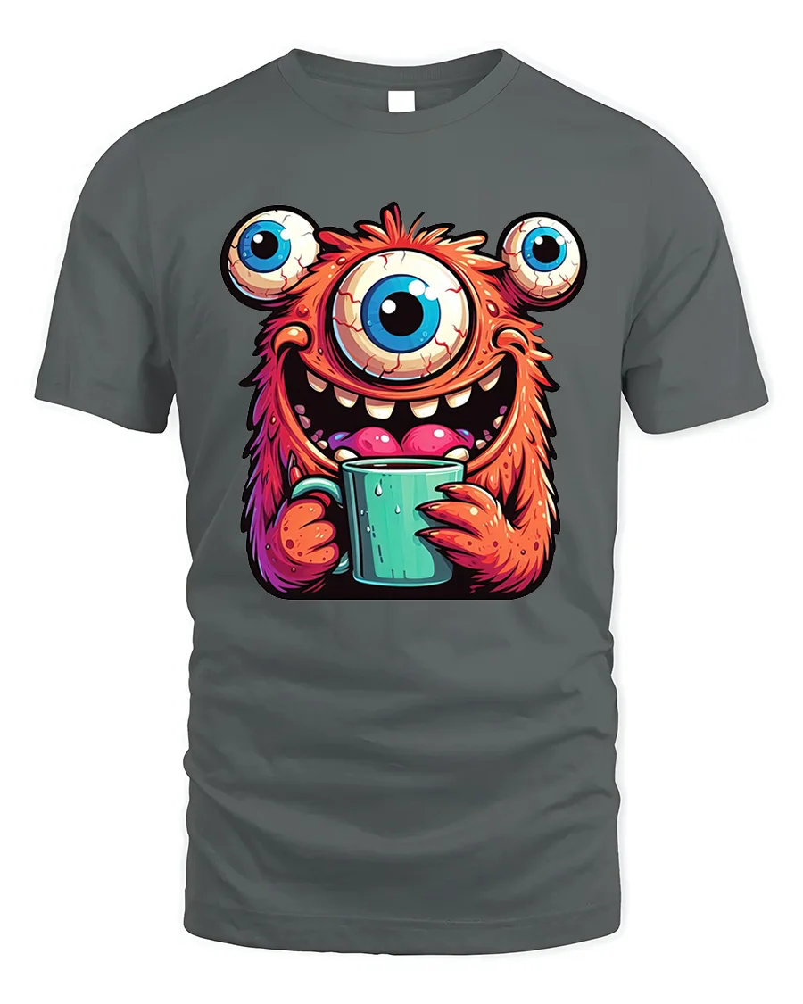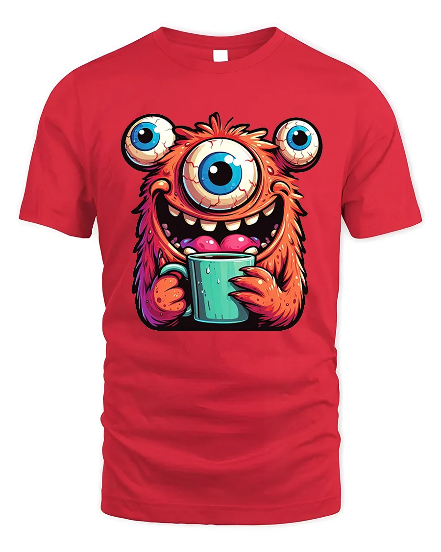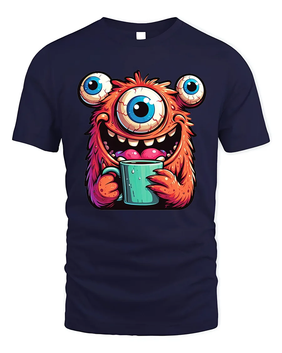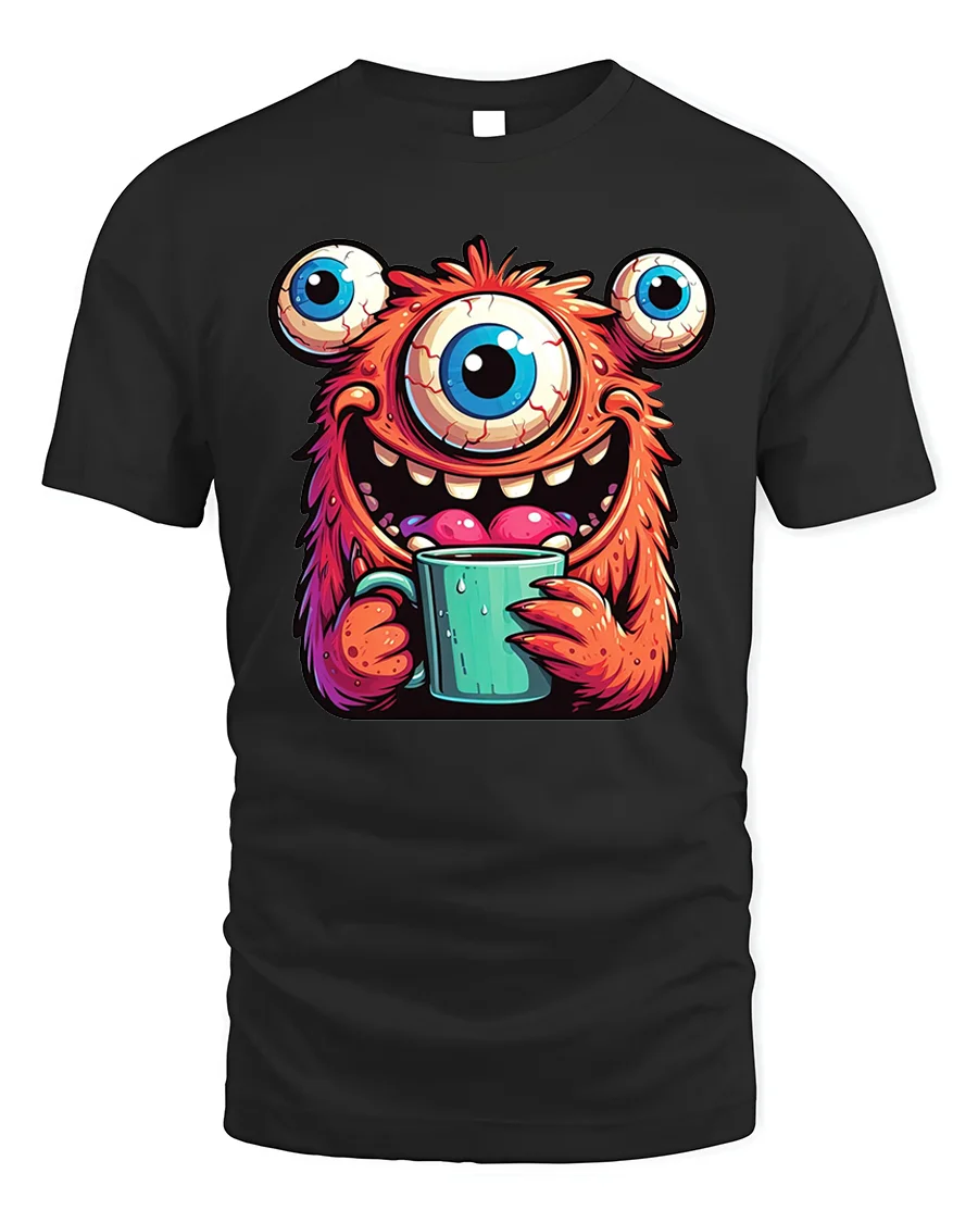 Featuring a hilarious three-eyed orange monster happily holding a steaming cup of coffee, this design perfectly blends humor, color, and creativity.