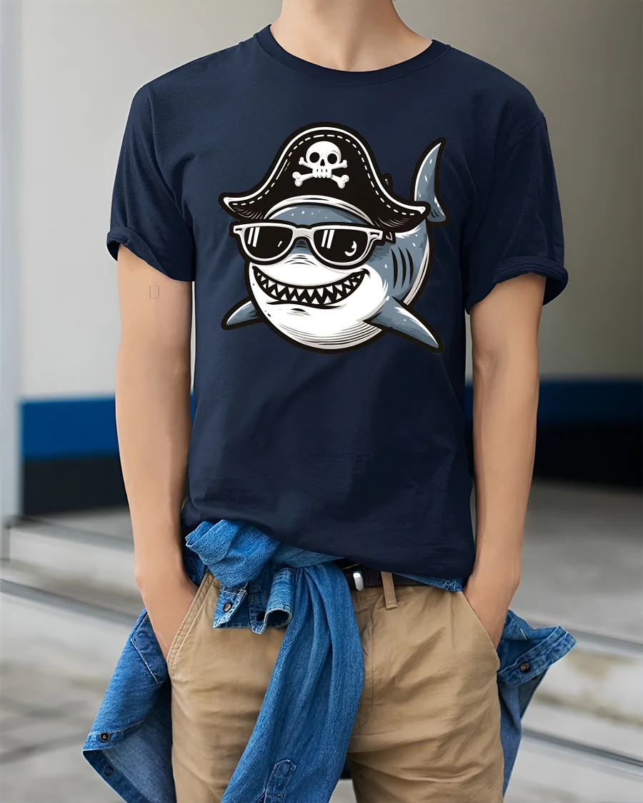 Funny Pirate Shark Tshirt Cool Ocean Cartoon Humor Graphic features a playful design that combines adventurous pirate style with fun marine life personality.