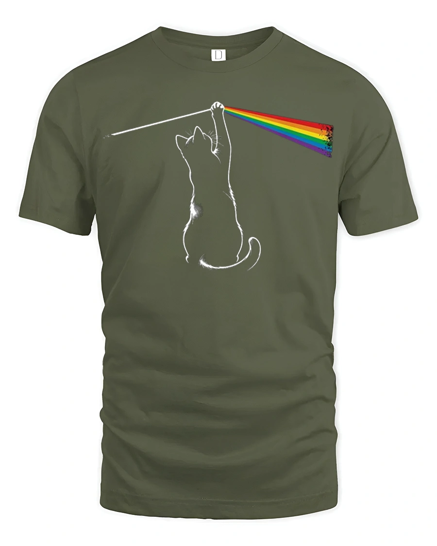 Funny Rainbow Laser Cat Graphic T Shirt Colorful Prism Cat Tee - military green t-shirt on white background