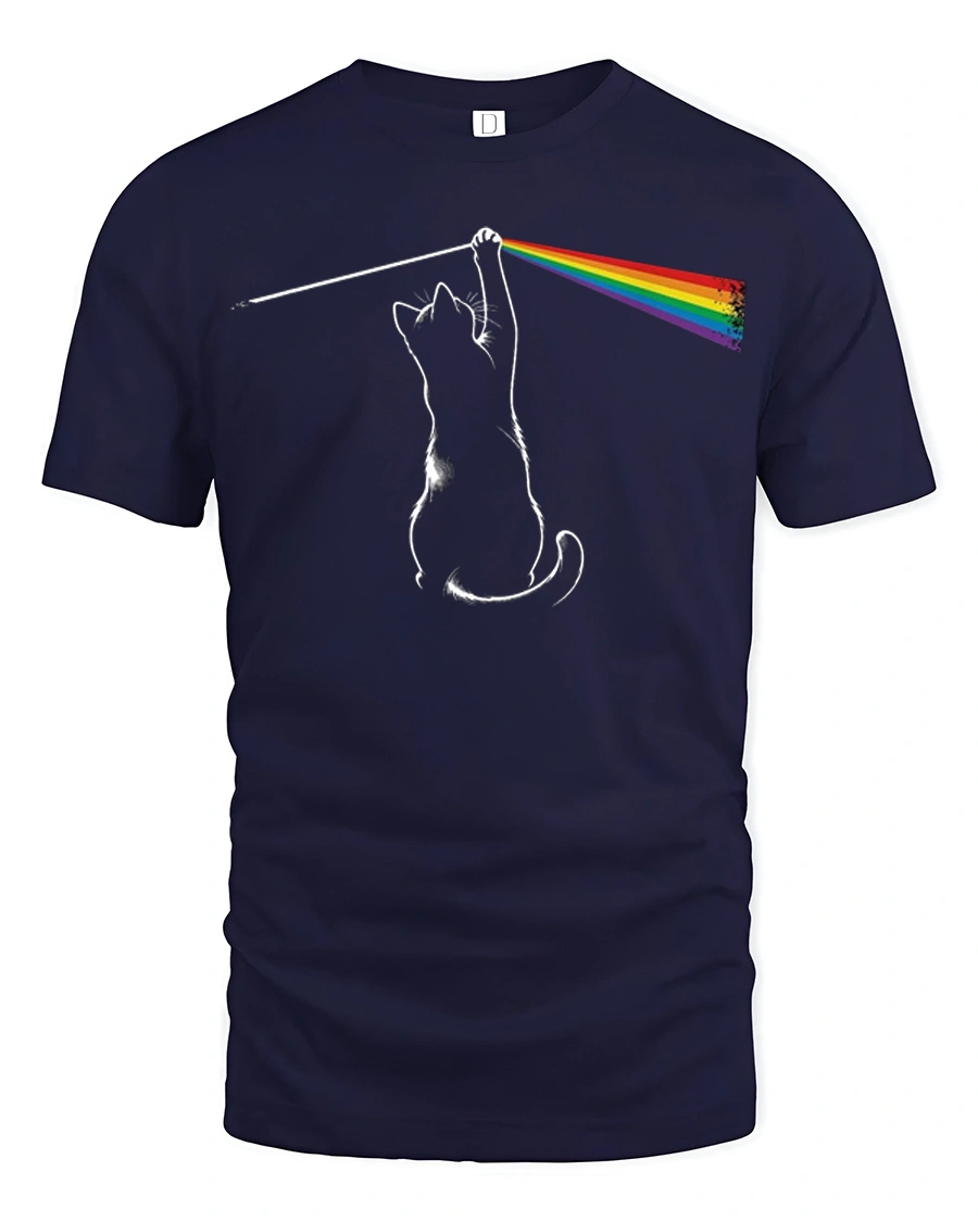 Funny Rainbow Laser Cat Graphic T Shirt Colorful Prism Cat Tee - model wearing navy tee with hands in pockets