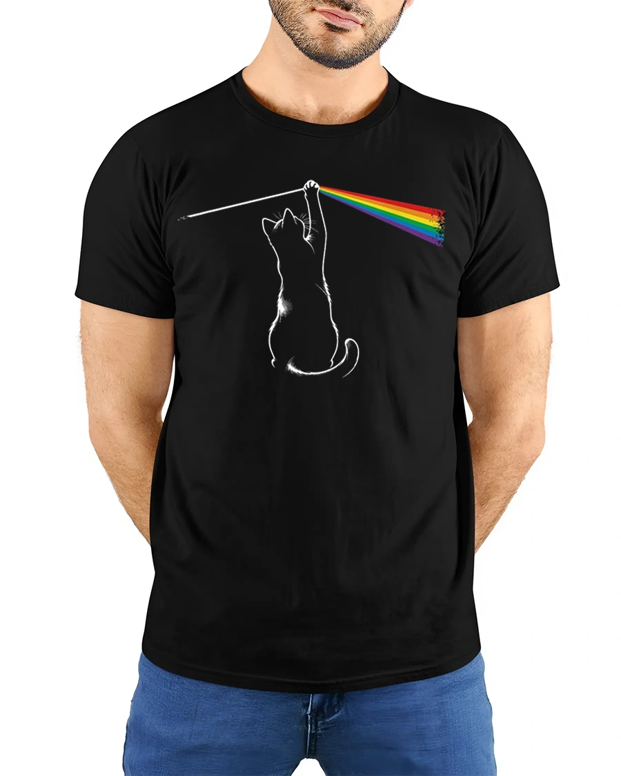 Funny Rainbow Laser Cat Graphic T Shirt Colorful Prism Cat Tee - model wearing black tee with hands behind back