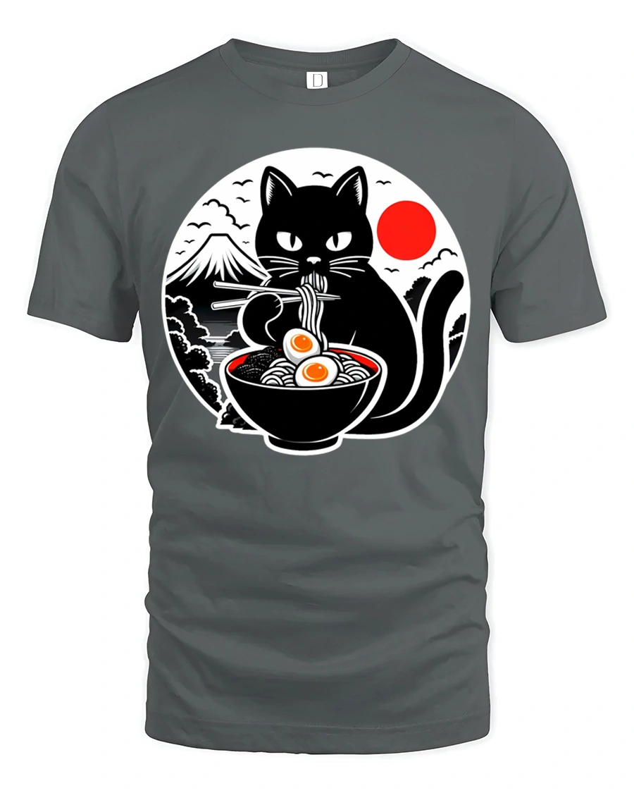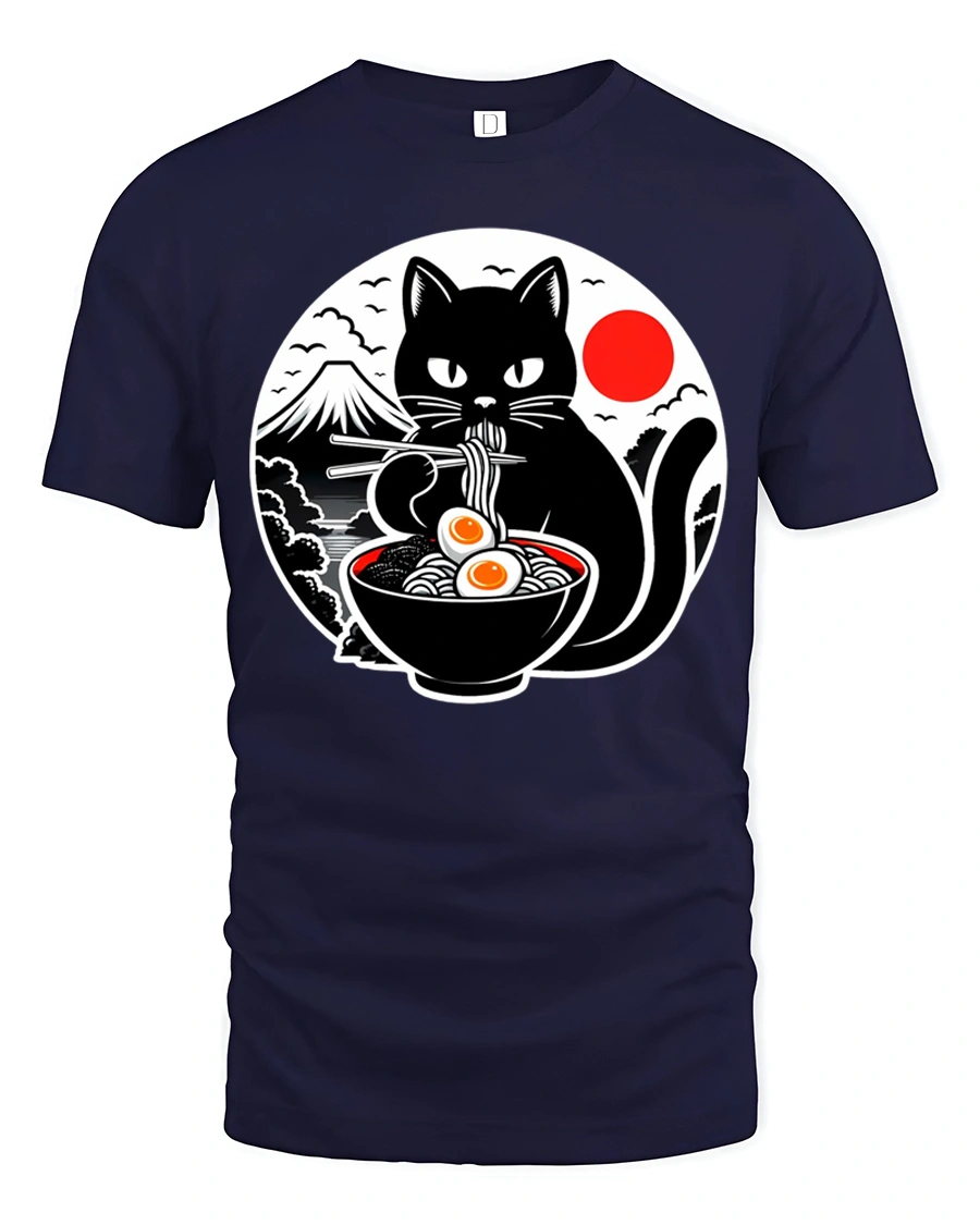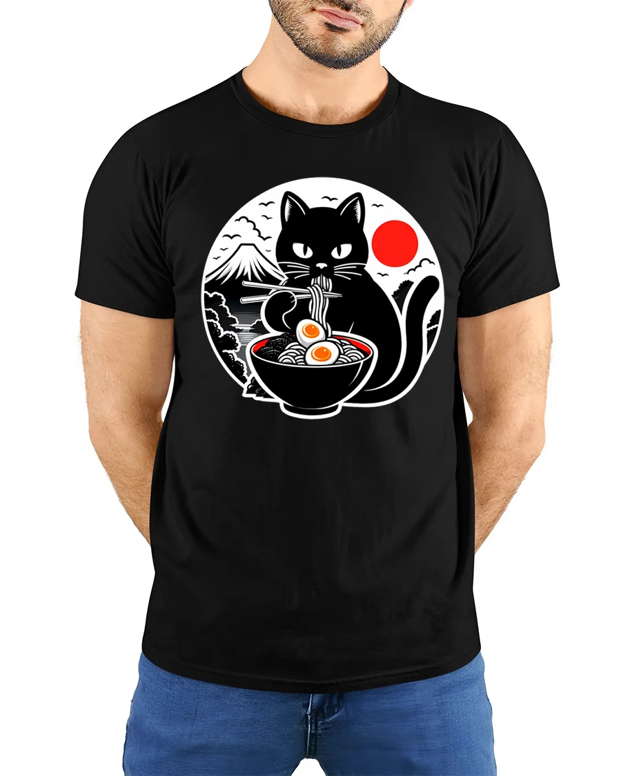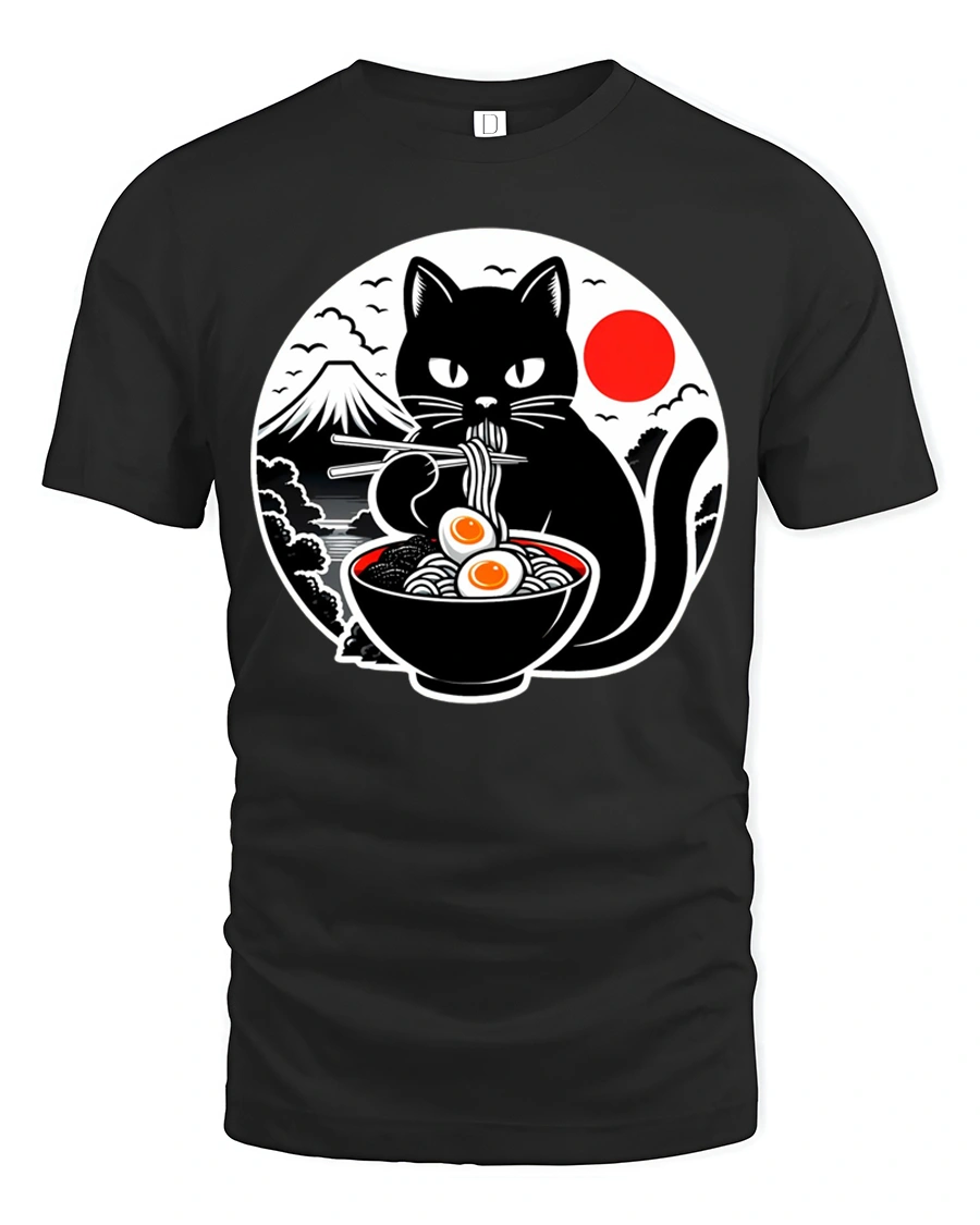 This funny ramen eating black cat japanese style graphic t shirt combines adorable cat charm with playful Japanese inspired food art.