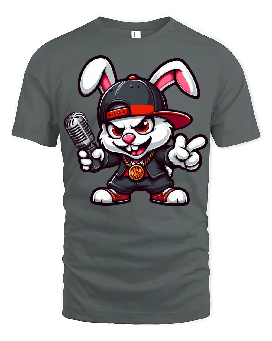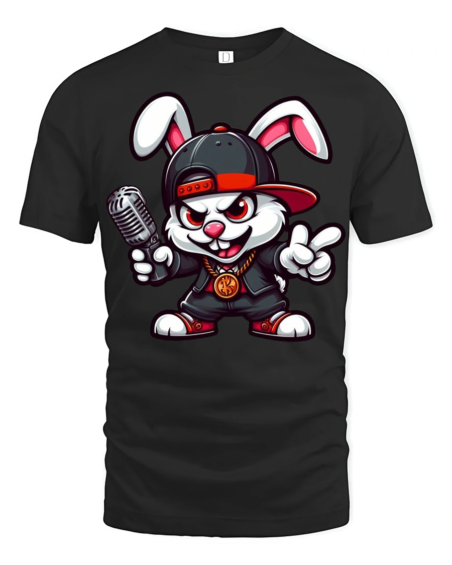 The design features a confident bunny dressed in hip hop fashion holding a microphone, creating a fun and expressive vibe.