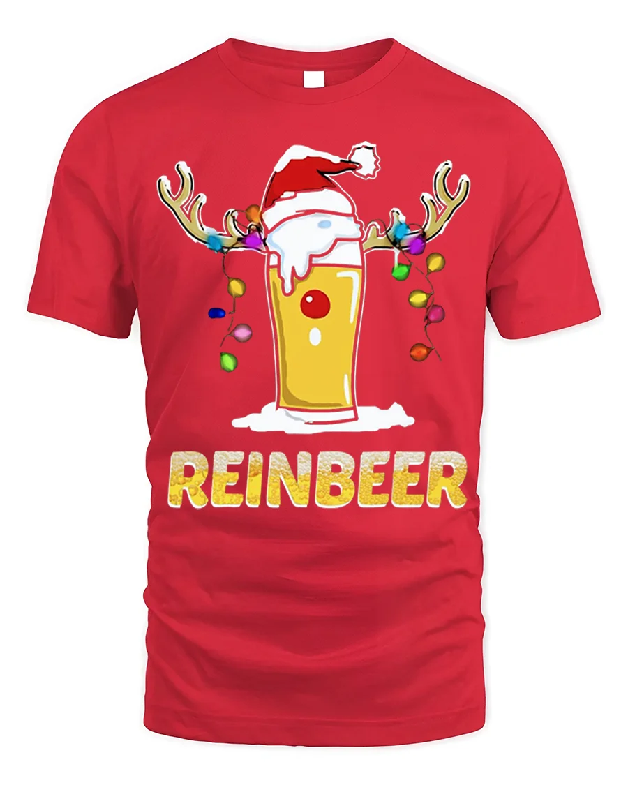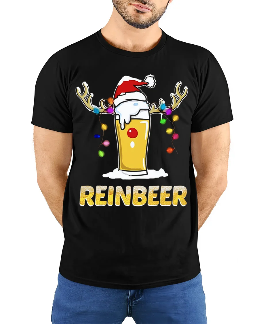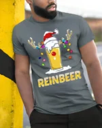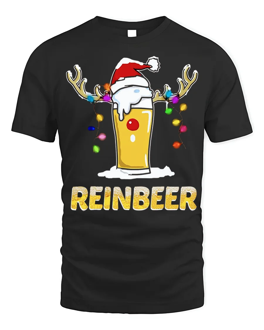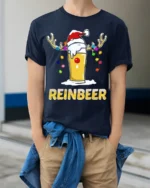 Get into the festive spirit with the Funny Reinbeer Christmas T-Shirt with Santa Hat and Lights. This hilarious design features a frosty beer glass dressed as a reindeer, complete with antlers, colorful holiday lights, and a Santa hat. It’s the perfect mix of Christmas cheer and beer humor that every party-goer or beer enthusiast will love.
