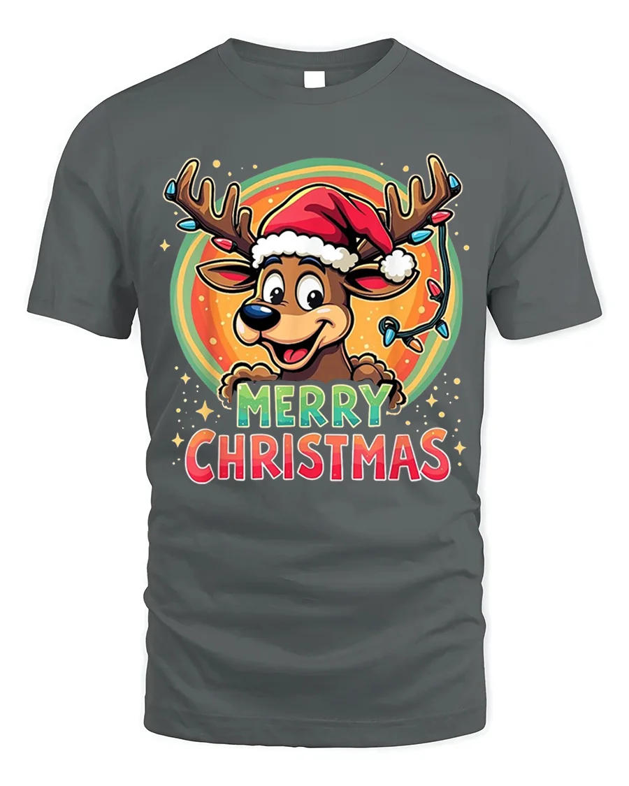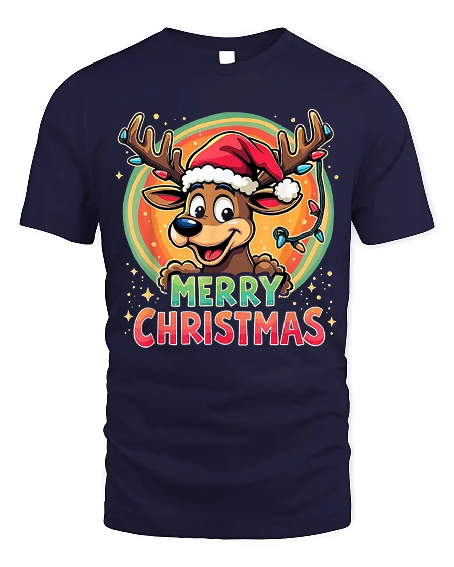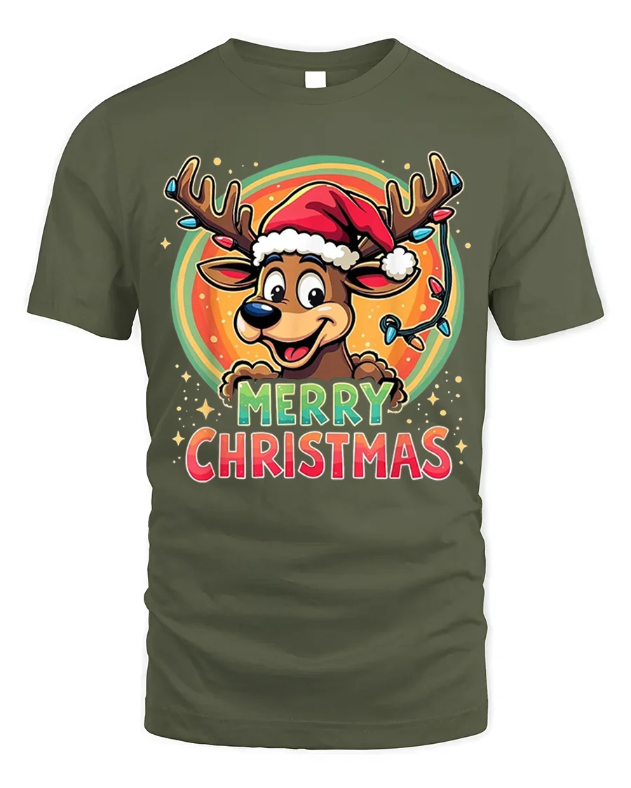 This cheerful design features a smiling reindeer wearing a Santa hat and tangled in colorful Christmas lights with the text “Merry Christmas.”