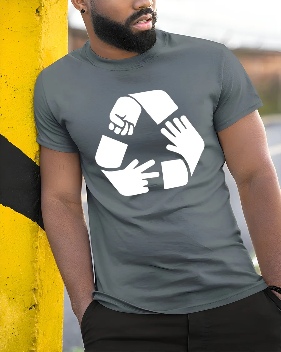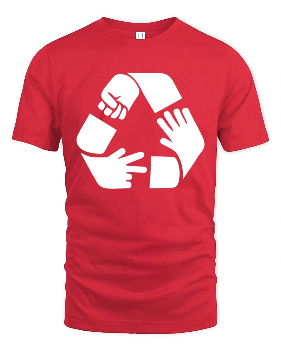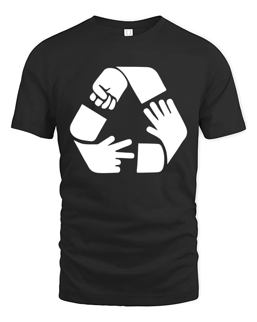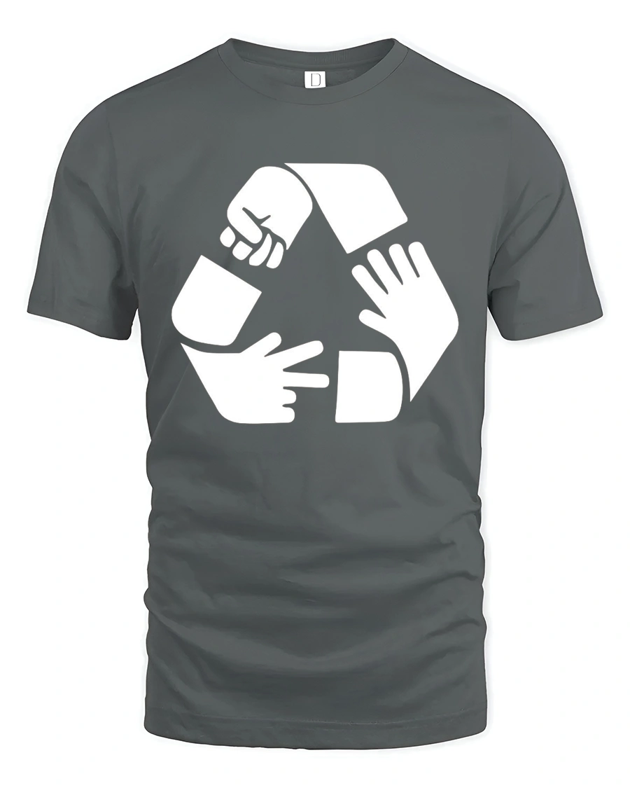 Funny Rock Paper Scissors Recycle Symbol Humor T Shirt delivers a clever twist on a classic game with a creative circular design.