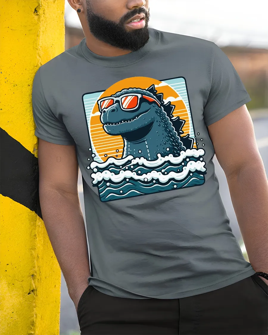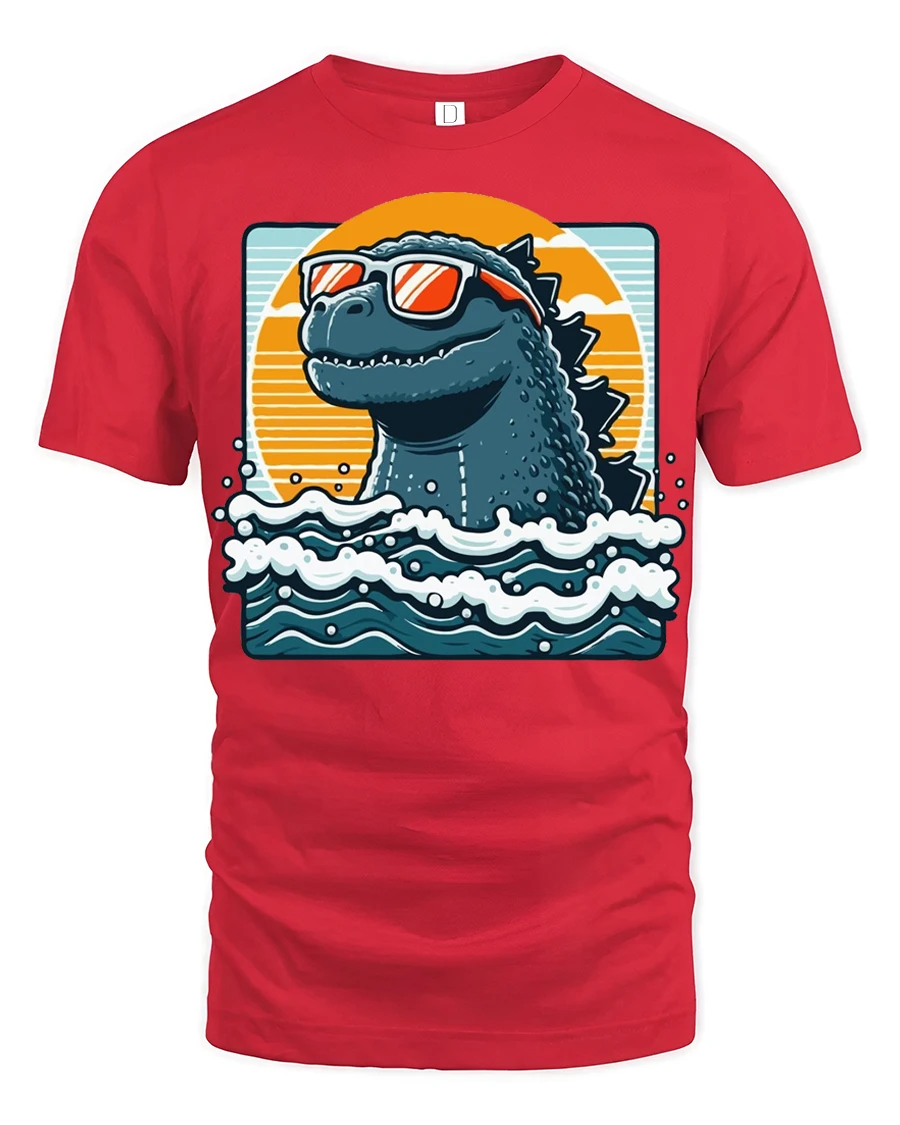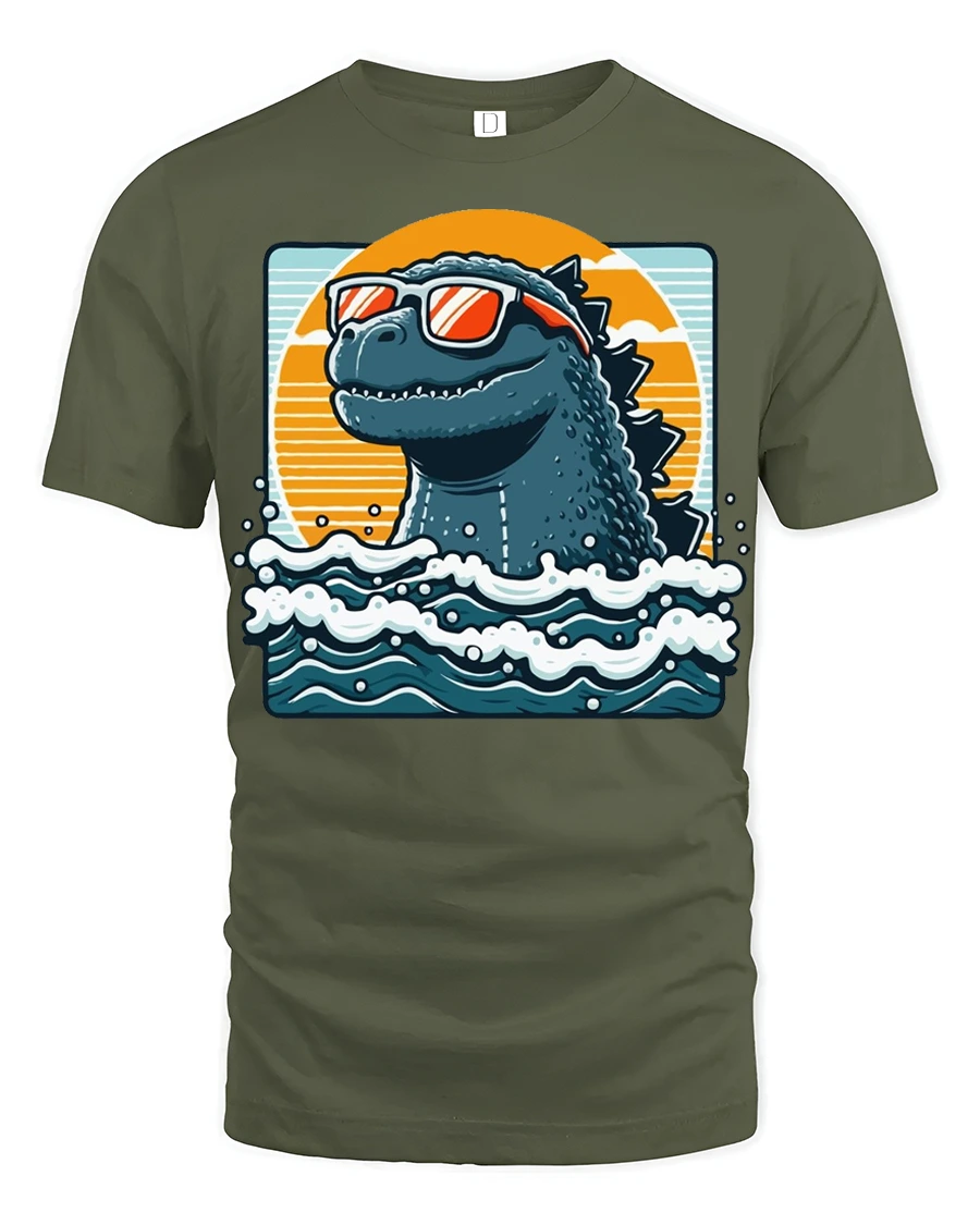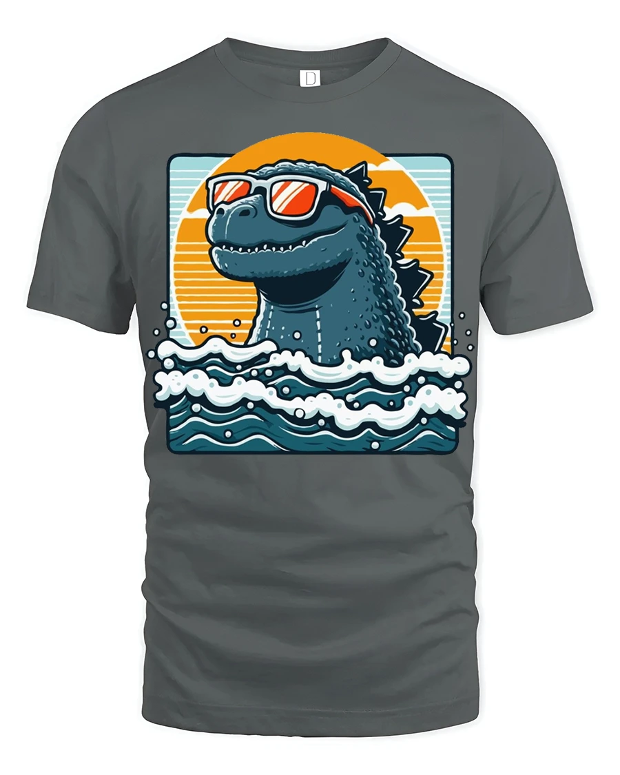 The design features a chill sea monster wearing sunglasses while riding ocean waves under a vibrant sunset.