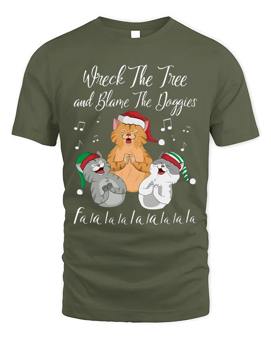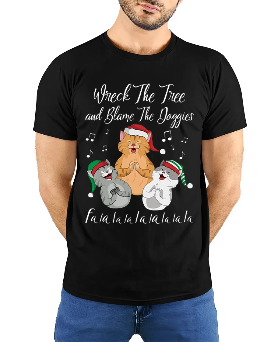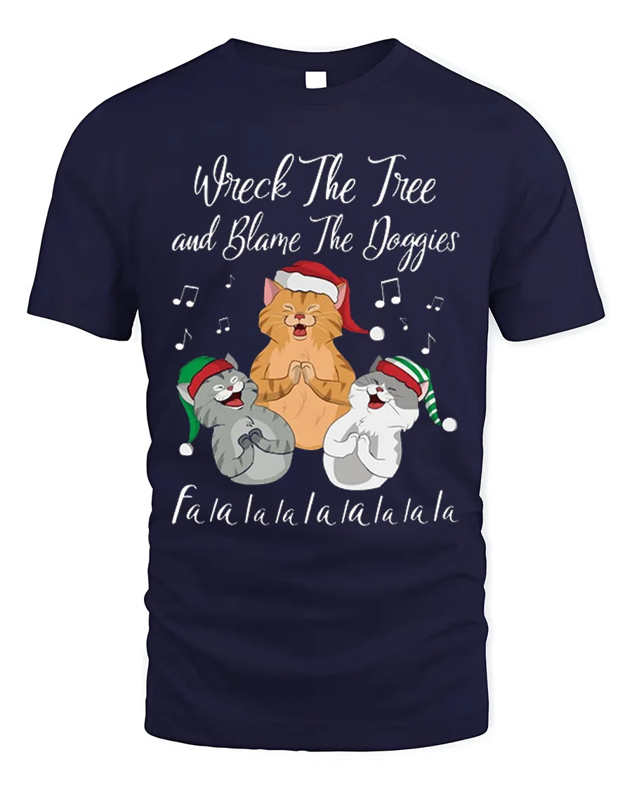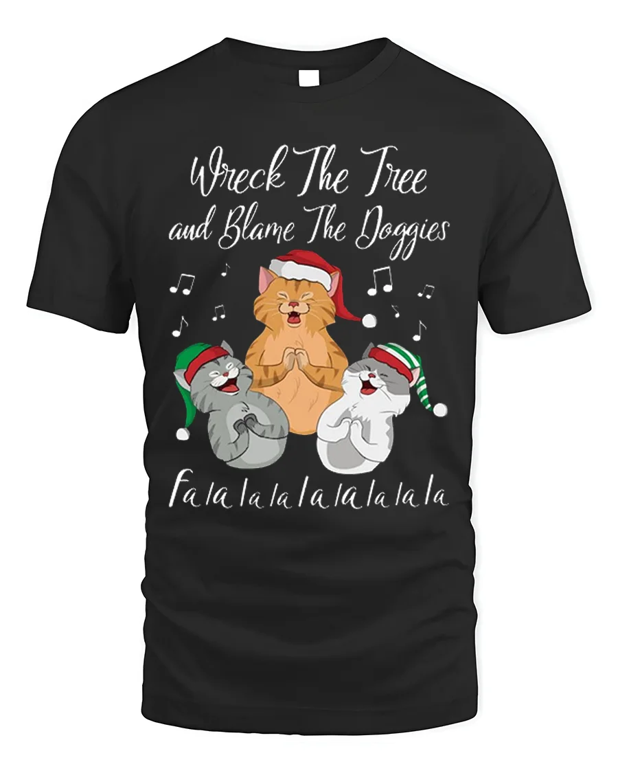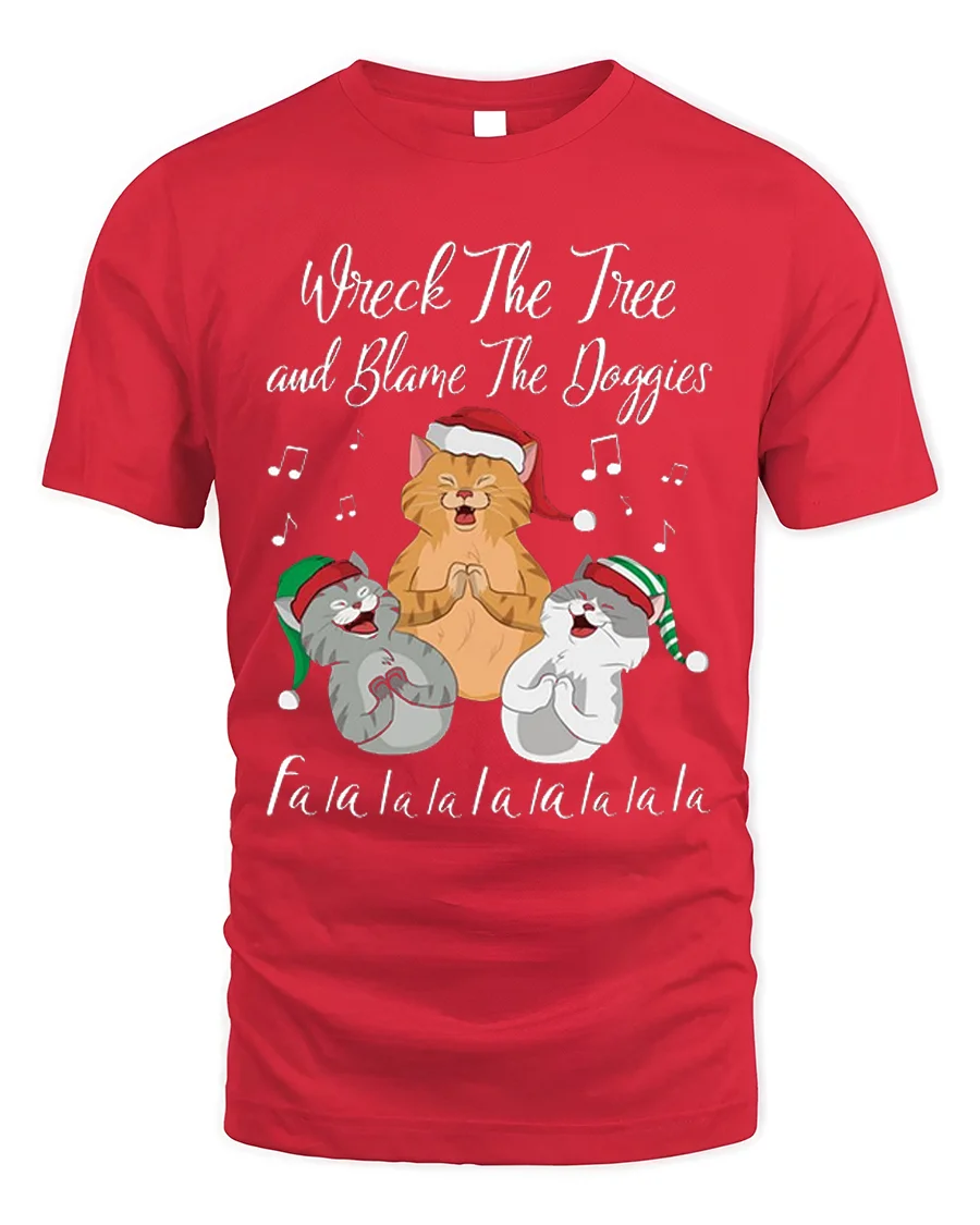 Bring laughter to your holidays with the Funny Singing Cats Christmas T-Shirt Wreck The Tree Design. This adorable design features three festive cats wearing Santa hats, singing joyfully with the funny quote “Wreck the tree and blame the doggies.” It’s the perfect Christmas tee for cat lovers who appreciate a good dose of humor and holiday cheer.