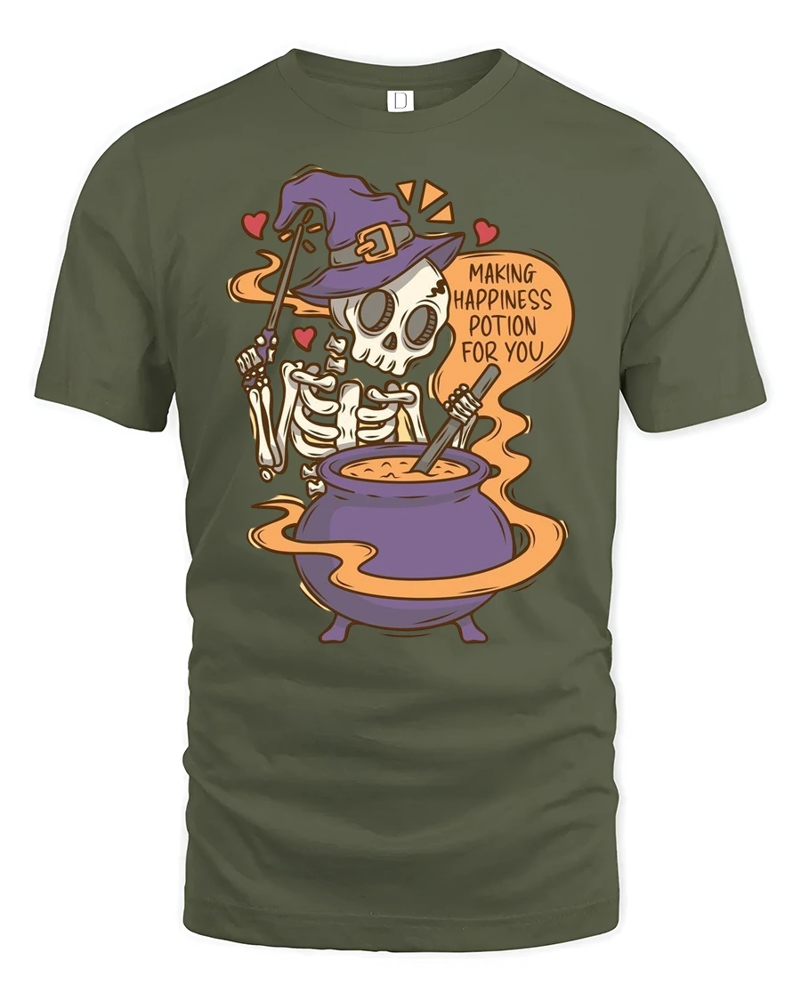 Funny Skeleton Witch Making Happiness Potion Cute Halloween T Shirt is a playful and charming design that blends spooky vibes with lighthearted humor.
