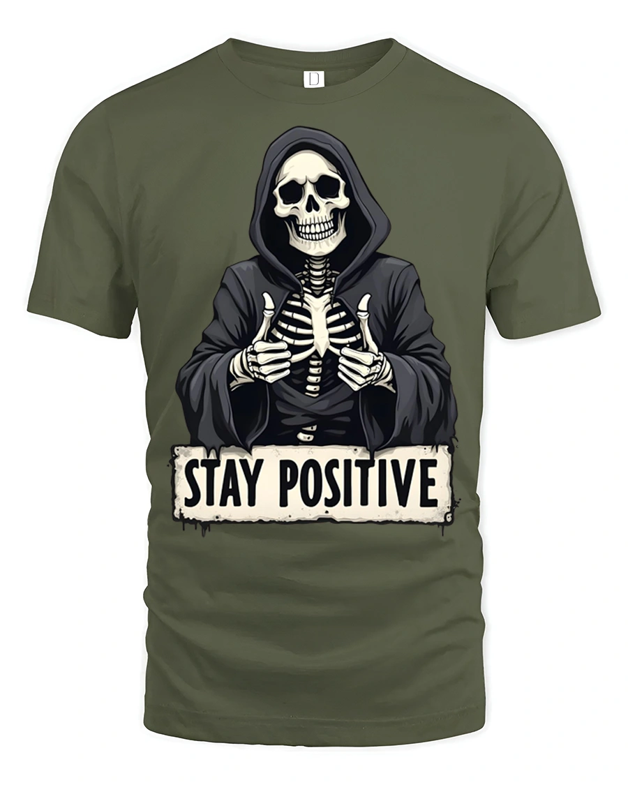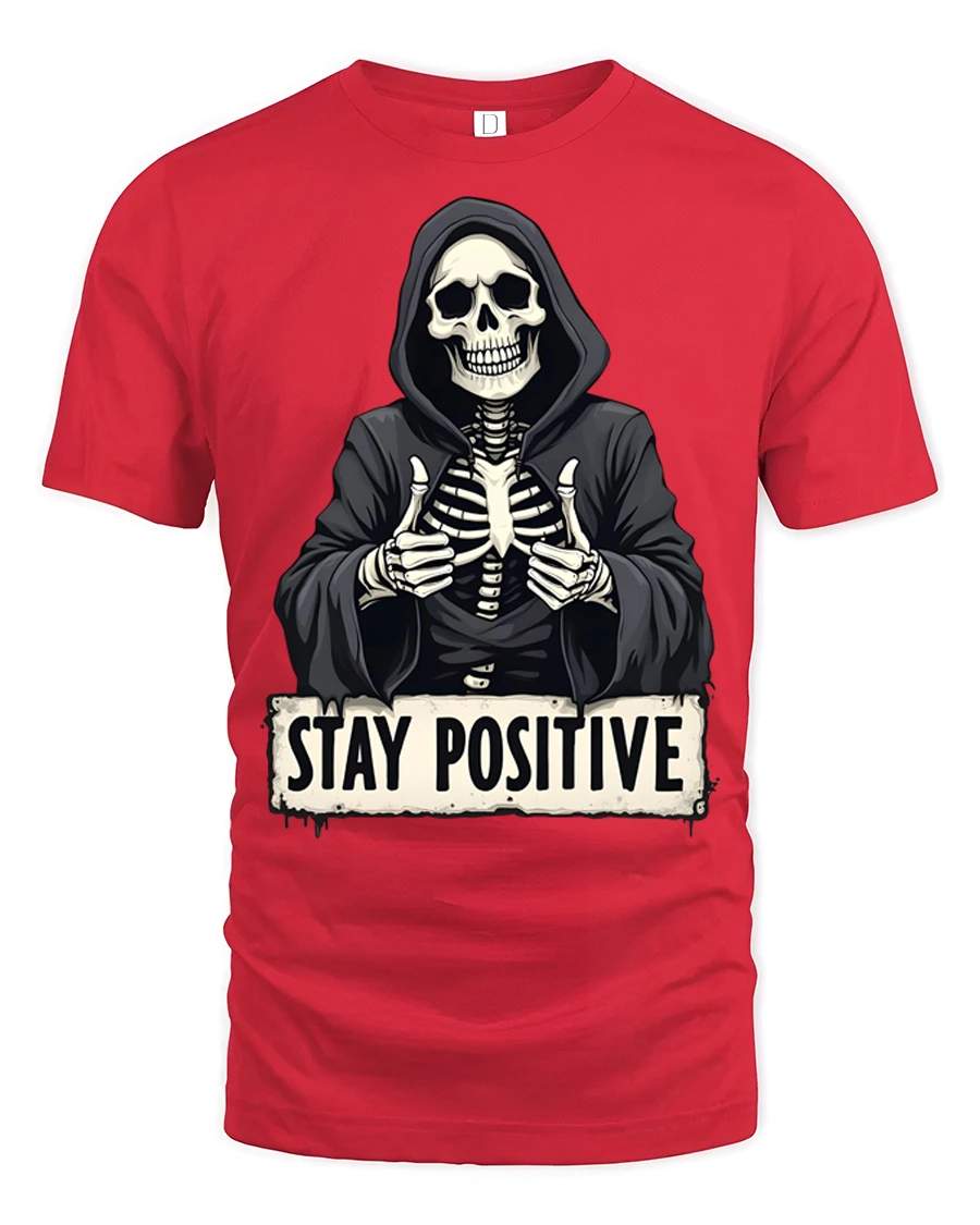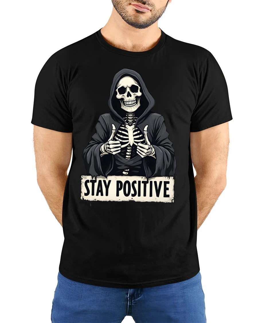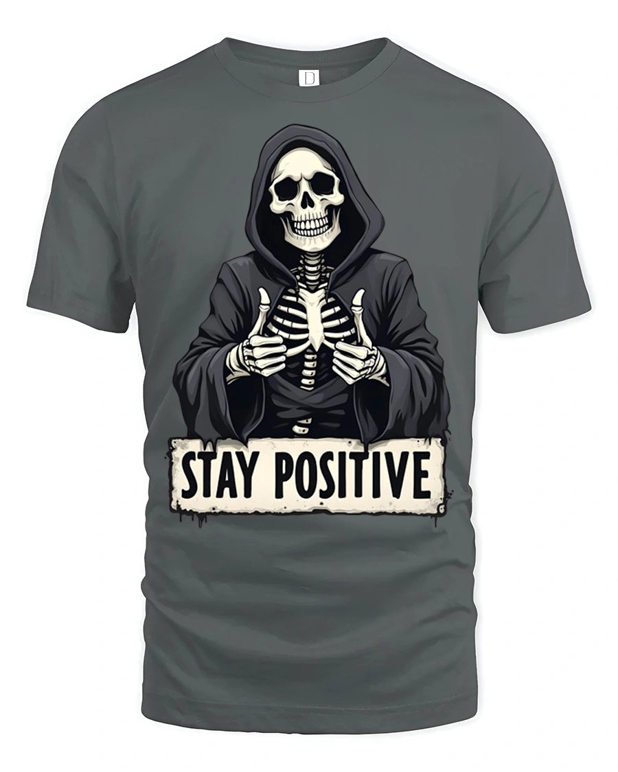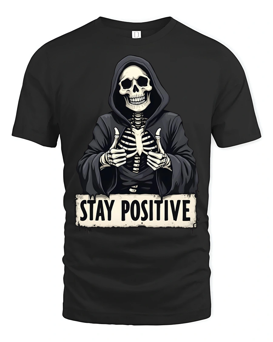 The artwork features a hooded skeleton giving a confident thumbs up while the phrase Stay Positive creates a playful ironic message.
