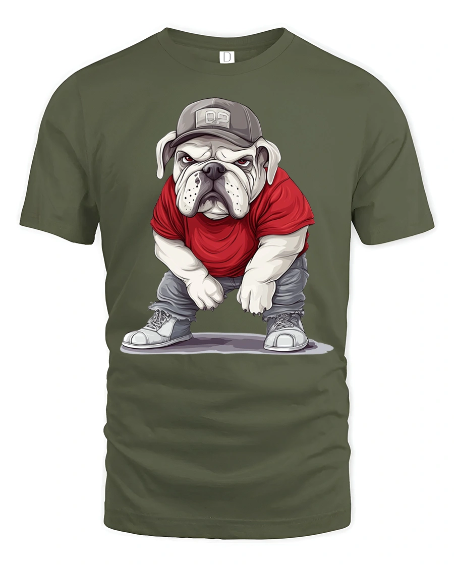 The illustration features a tough looking bulldog dressed in casual street style clothing, giving the character a confident and humorous personality.